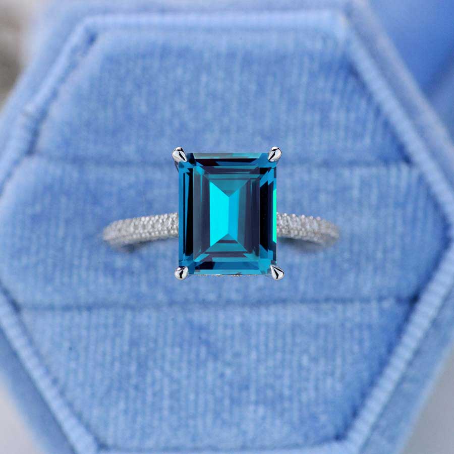 5ct Emerald Shaped Step Cut Cornflower Sapphire Ring, 5 Carat Cornflower Sapphire Engagement Ring, Cornflower Sapphire Pave Accent Stones Hidden Halo Ring