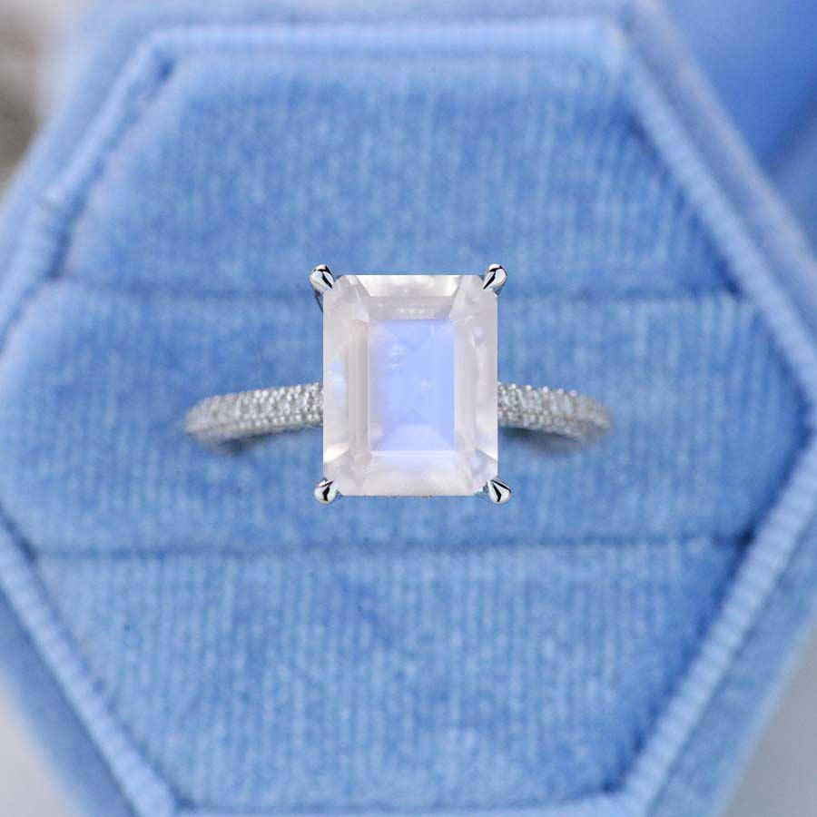 5ct Emerald Shaped Step Cut Natural Moonstone Ring, 5 Carat Natural Moonstone Engagement Ring, Natural Moonstone Pave Accent Stones Hidden Halo Ring