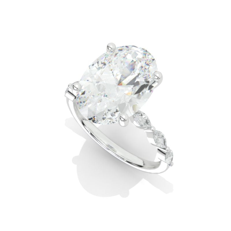 The default design option features approximately 6 Carat Oval Cut 14x10mm LAB-Grown Diamond Center StoneĀ D-Colorless, VVS1-Clarity, VG-Cut, Ex-Polish, VG-Symmetry, Set with Colorless LAB-Grown Diamond Accent stonesĀ in 14KĀ White Gold Engagement Ring.Ā