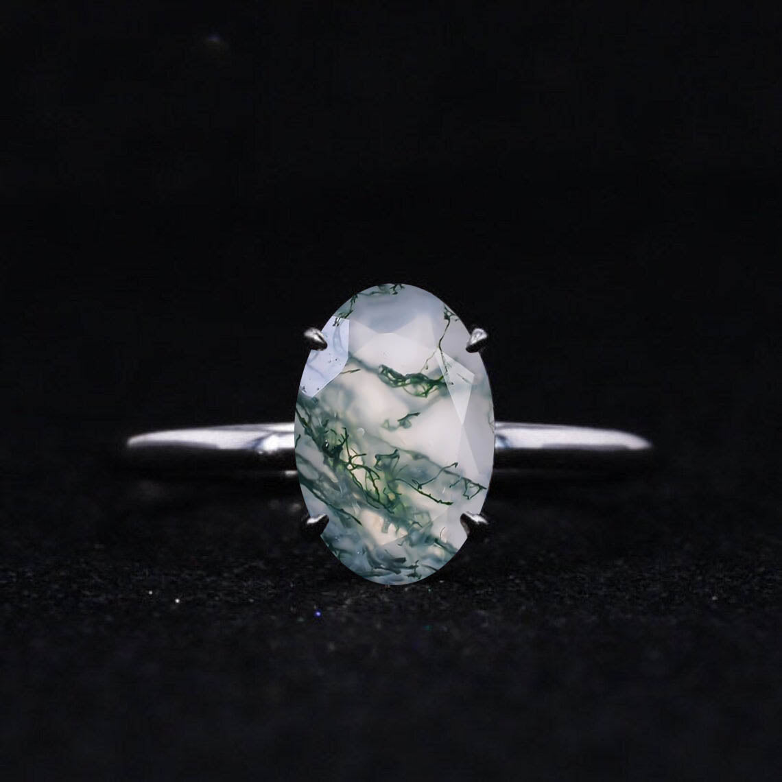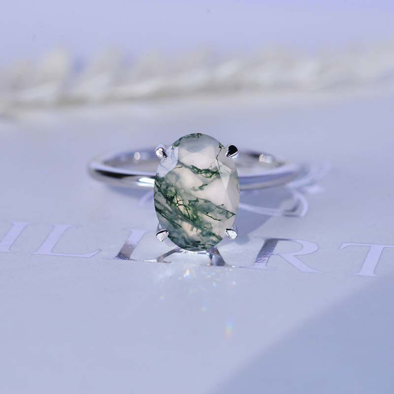 6 Carat Oval Cut Genuine Moss Agate Ring, Hidden Halo Gold Engagement - Giliarto