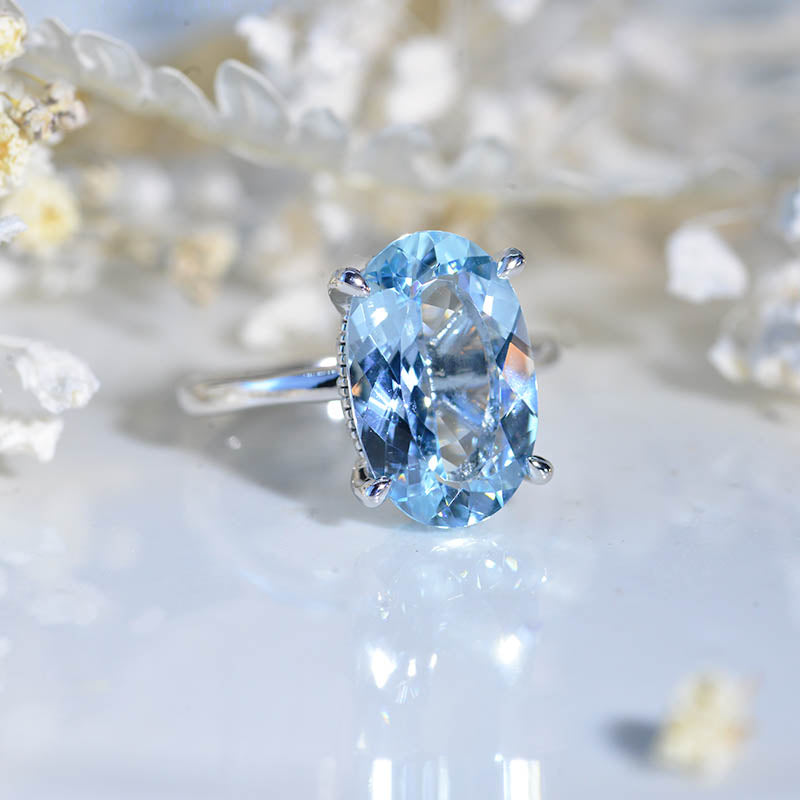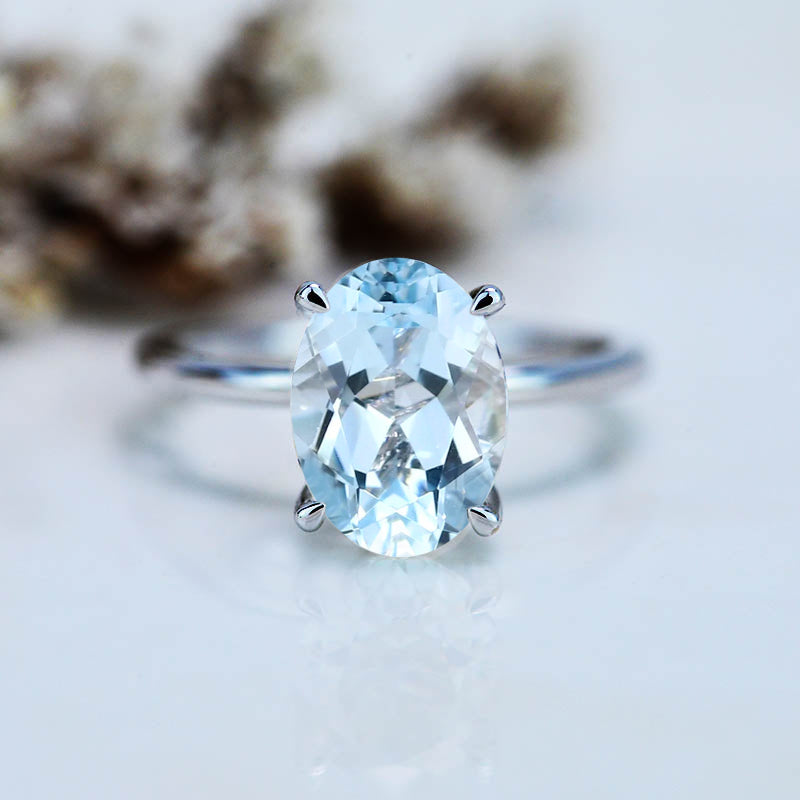 6 Carat Oval Cut Genuine Natural Aquamarine Ring, Hidden Halo Gold Engagement Ring