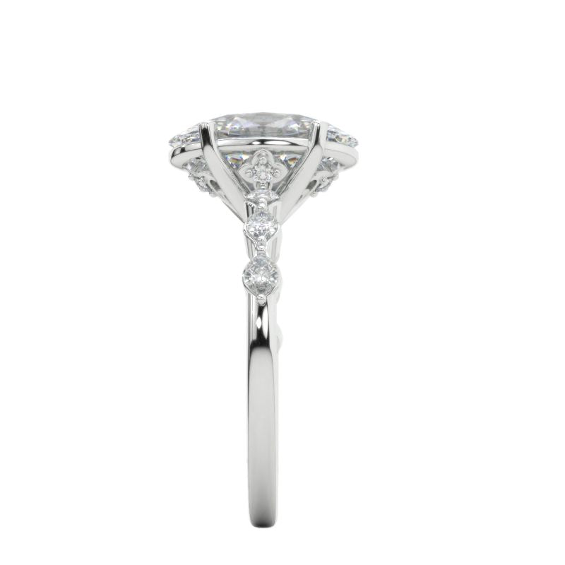 The default design option features approximately 6+ Carat LAB-Grown Diamond Oval 12x9mm D-Colorless, VVS1-Clarity,VG-Cut,Ex-Polish, VG-Symmetry Center Stone