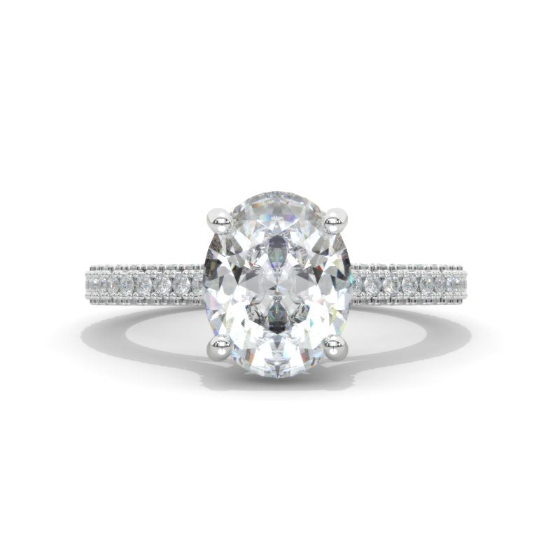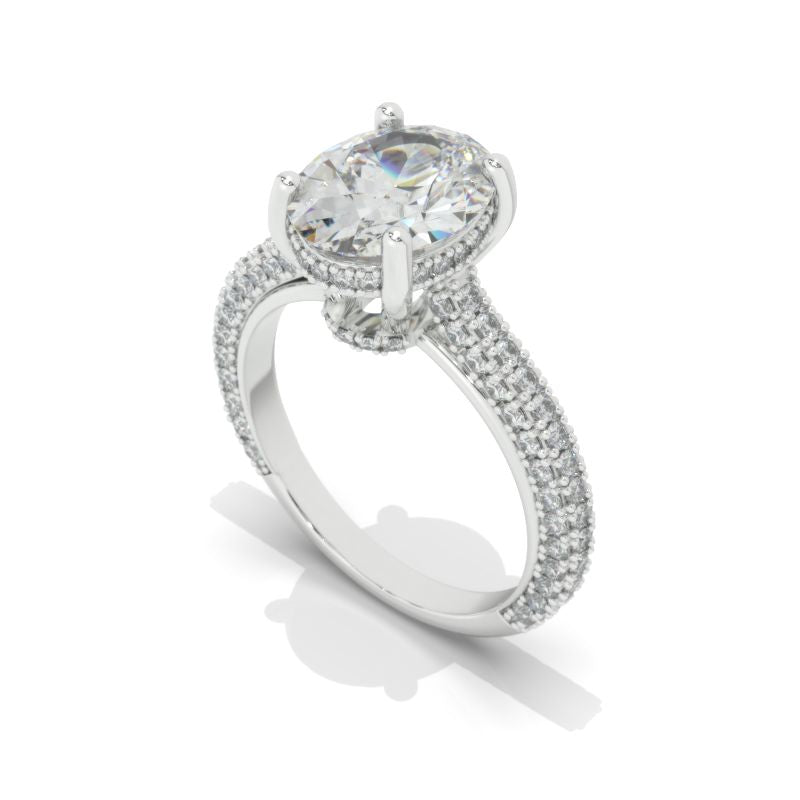 Approximately 6+ Carat LAB-Grown Diamond Oval 12x9mm D-Colorless, VVS1-Clarity, VG-Cut, Ex-Polish, VG-Symmetry Center Stone with 86 Colorless 1.1 CTW LAB-Grown Diamond (D-Colorless VVS1clarity) Accent Stones 14K White Gold Ring.
