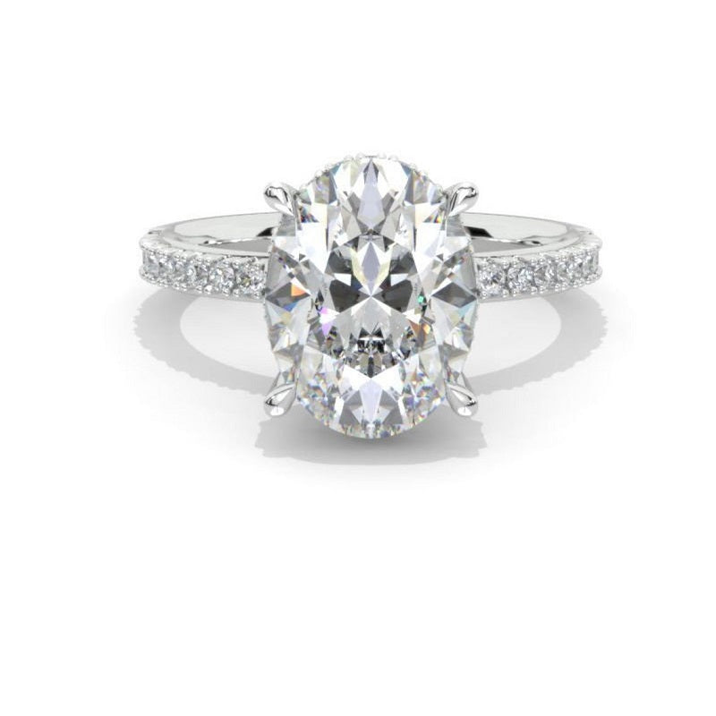 The default design option features 12x9mm Oval Cut LAB-Grown Diamond Stones,Ā D-Colorless VVS1-Clarity, VG-Cut, Ex-Polish, VG-Symmetry set with D- Colorless LAB-Grown DiamondĀ Accent StonesĀ