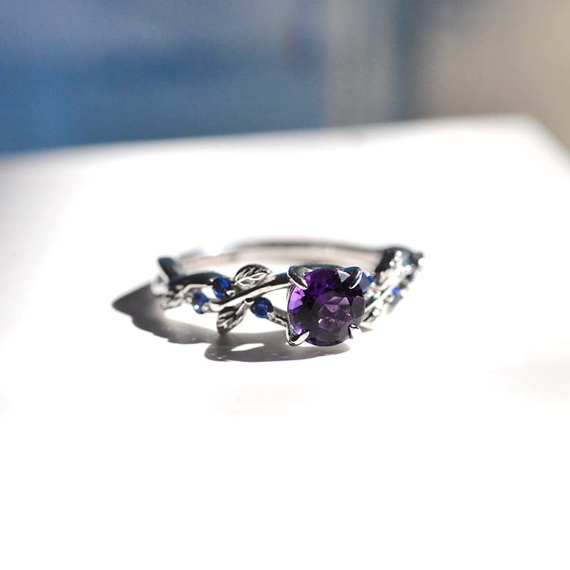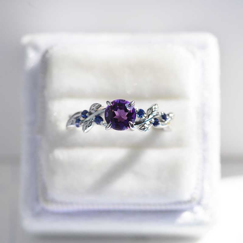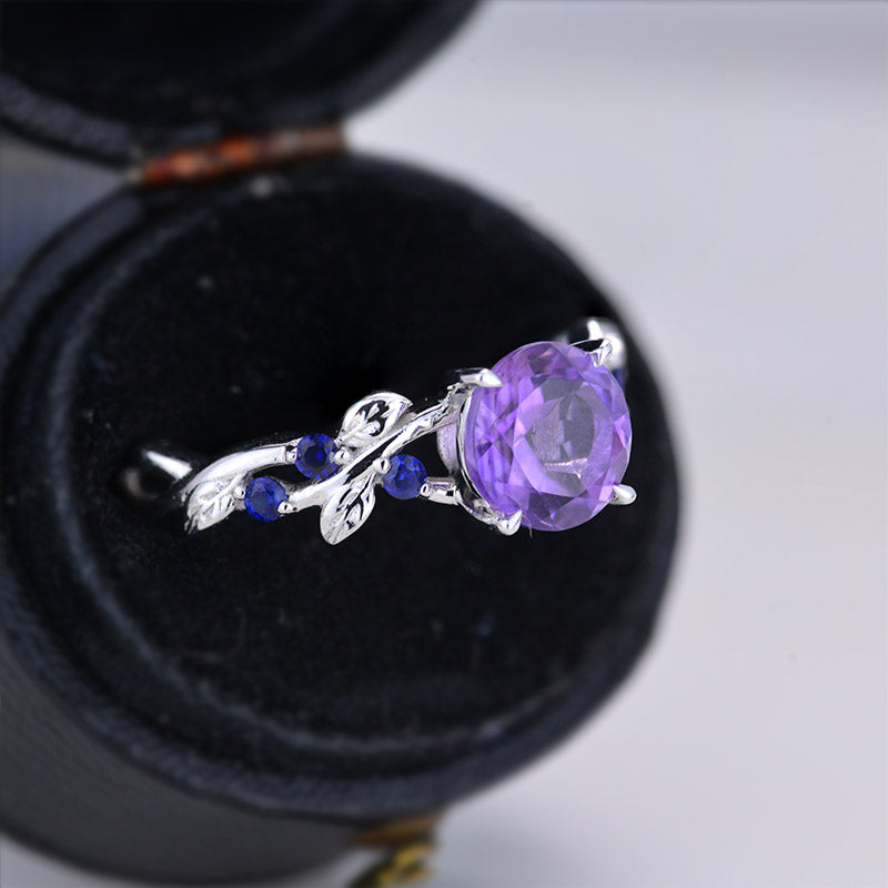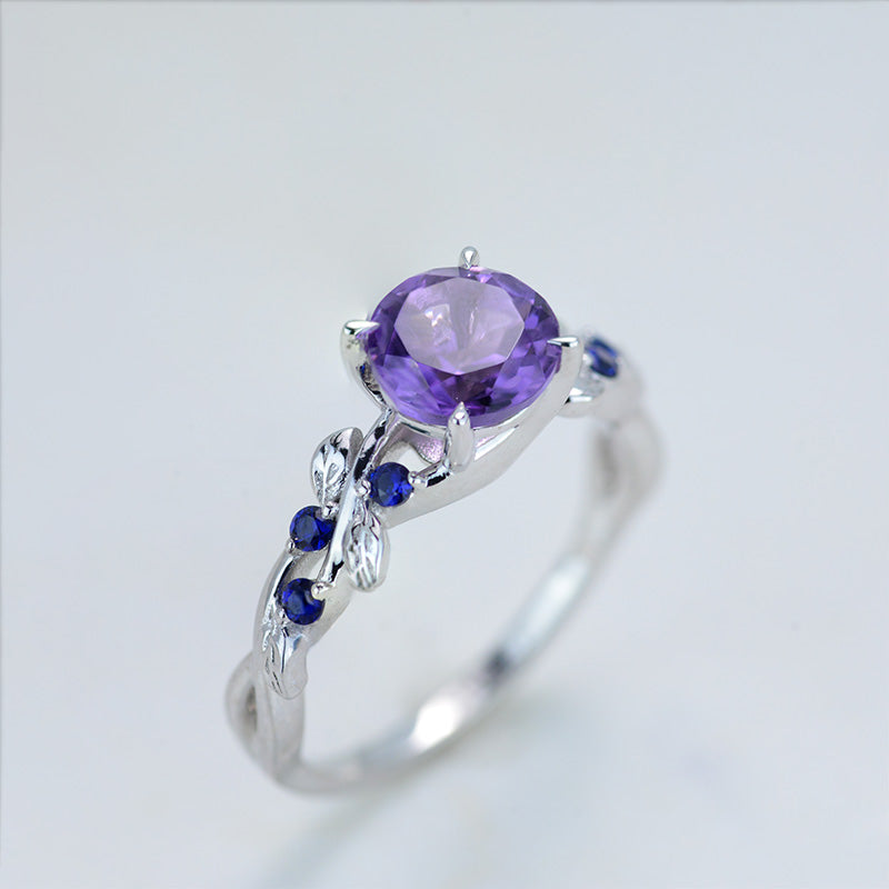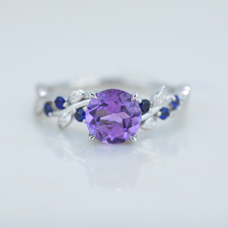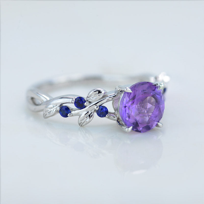 7mm Round Amethyst Sapphire Floral White Gold Engagement Ring - Giliarto
