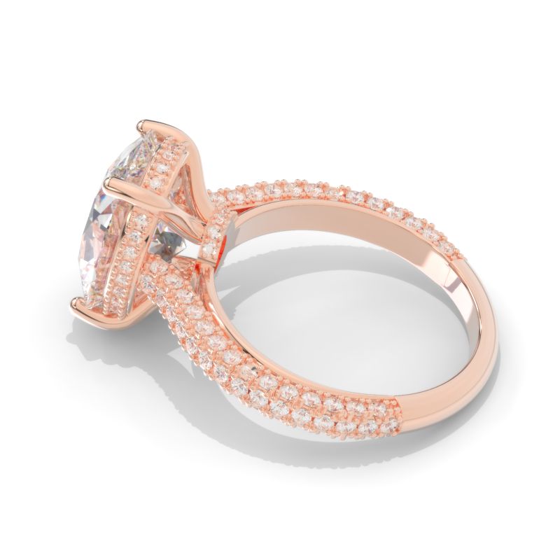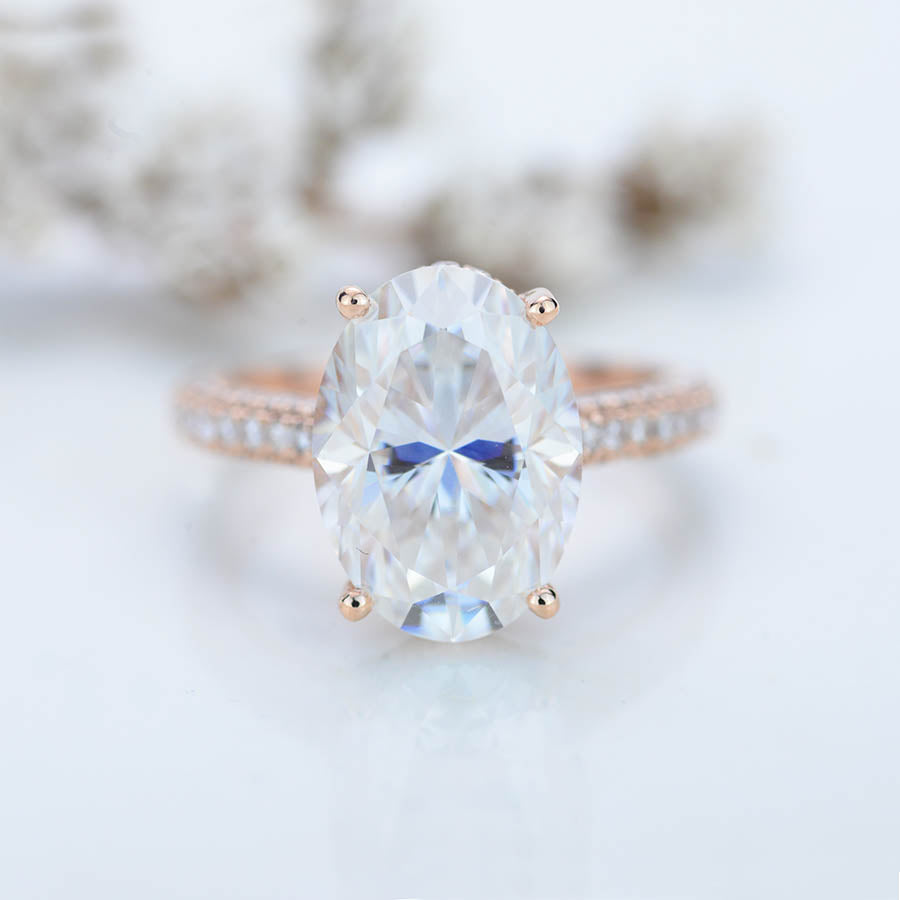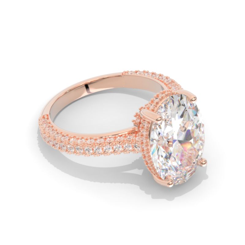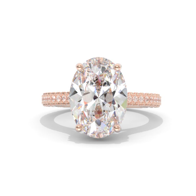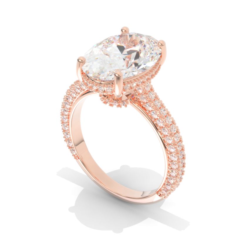 The default design option features 8 Carat Oval Cut 14x10mm Giliarto Moissanite Center Stone D-Colorless, VVS1-Clarity, VG-Cut, Ex-Polish, VG-Symmetry, Set With 148 - Accent Stones 0.37 CTW
