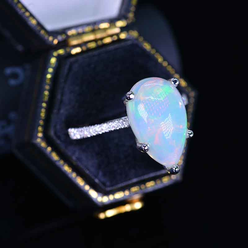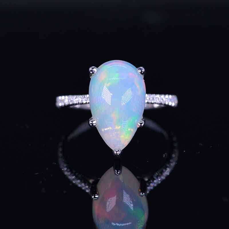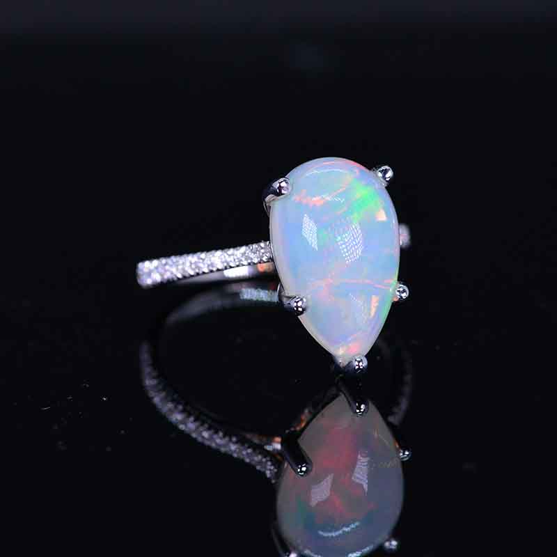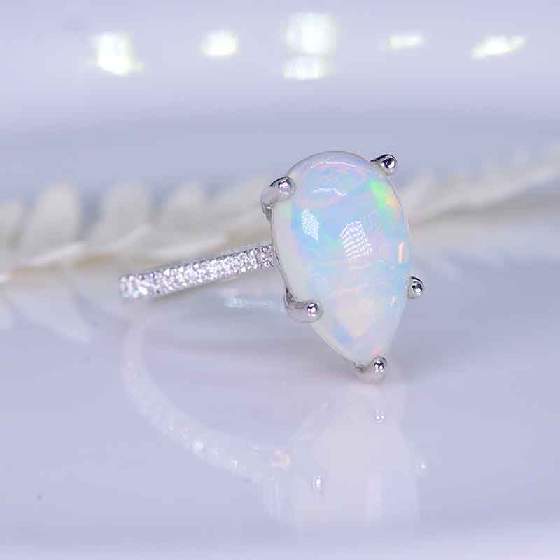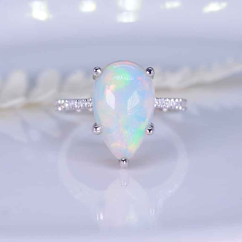 The default design option features Pear Cut 16x10mm Approximately 8 Carat Pear Genuine Natural White Opal 14K White Gold Engagement Ring Center Stone Ex-Polish, VG-Symmetry, Set with Colorless Moissanite Accent stones in 14K White Gold Engagement Ring.
