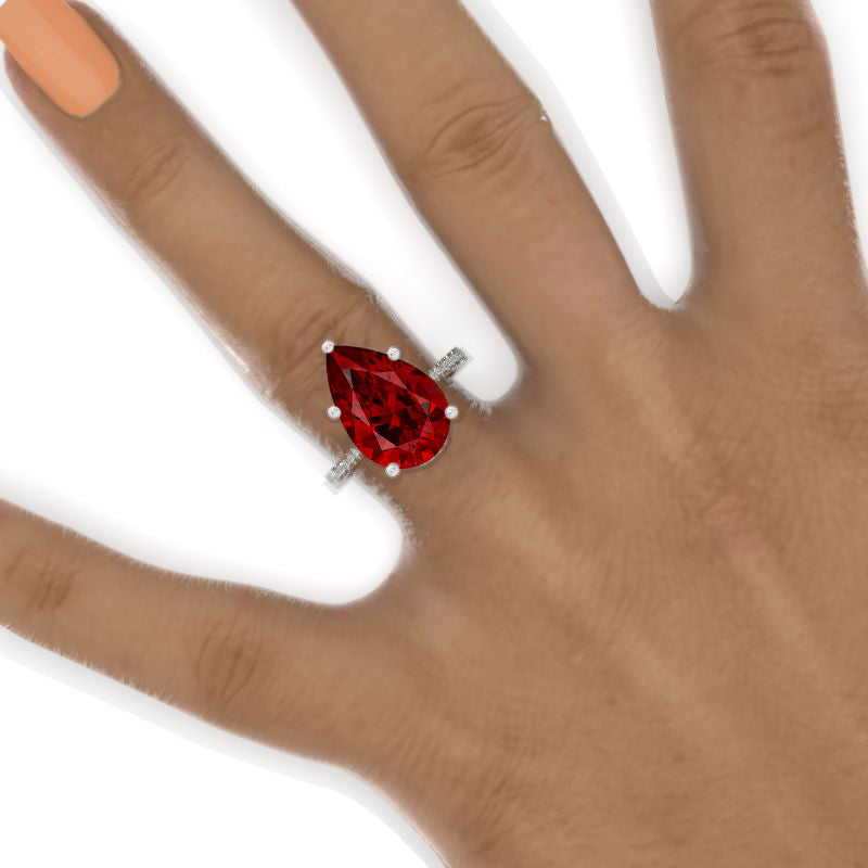 The default design option features Pear Cut 16x10mm Giliarto Ethically Lab-Grown Ruby AAA+ Grade-Center Stone VG-Cut, Ex-Polish, VG-Symmetry, Set with Colorless Moissanite Accent stones in 14K White Gold Engagement Ring.