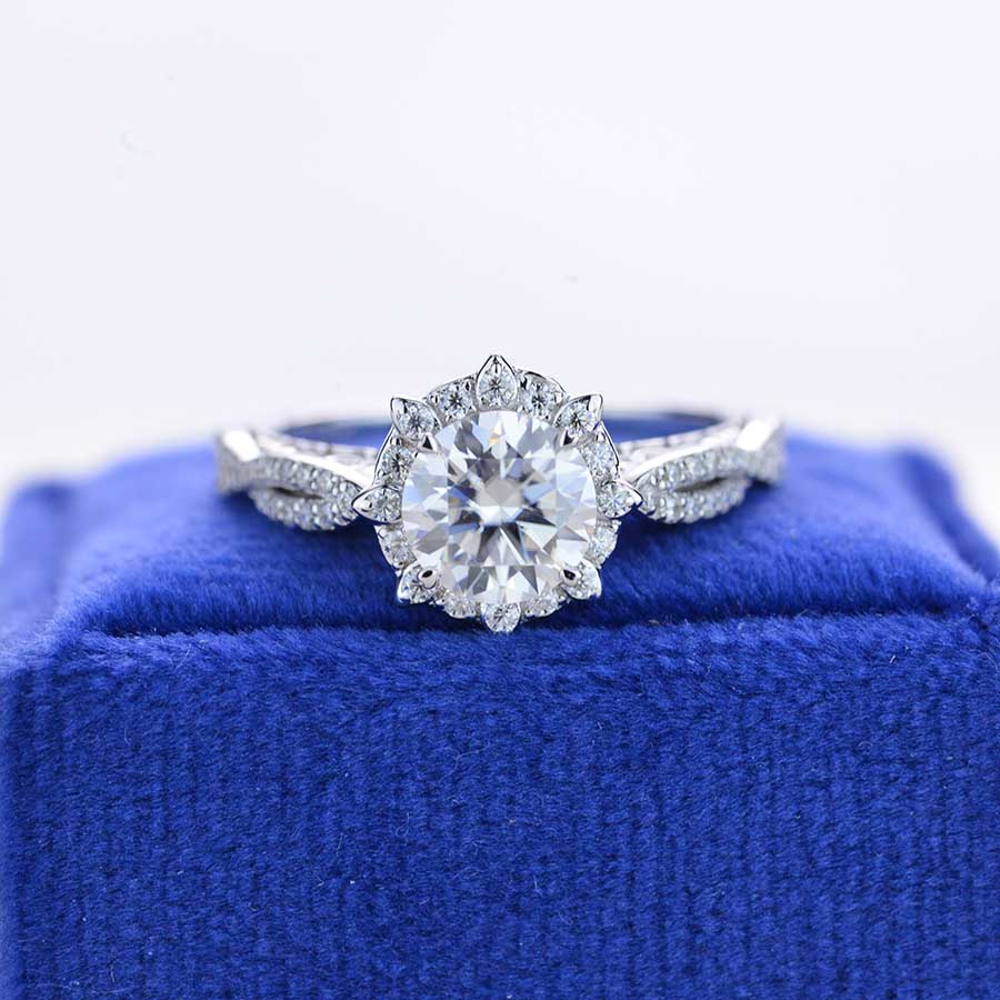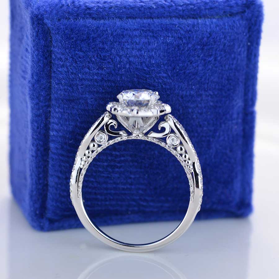 On the image featured 7 mm Round Giliarto moissanite ( D-Colorless, VVS1-Clarity, VG-Symmetry) with 30 - 0.2 CTW D-Colorless, VVS1 clarity moissanite accent stones and 14K white gold ring.