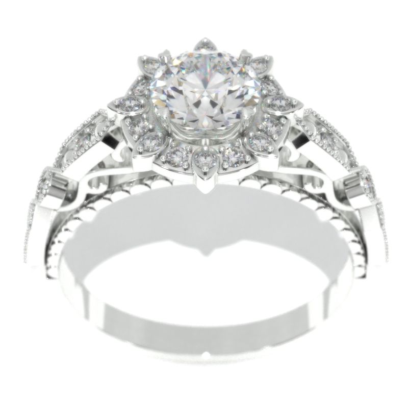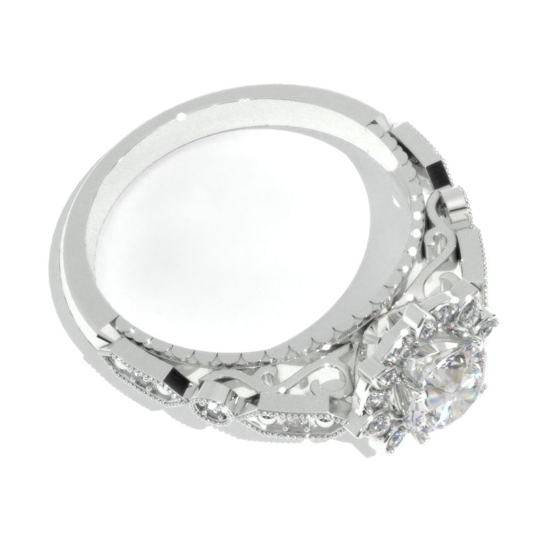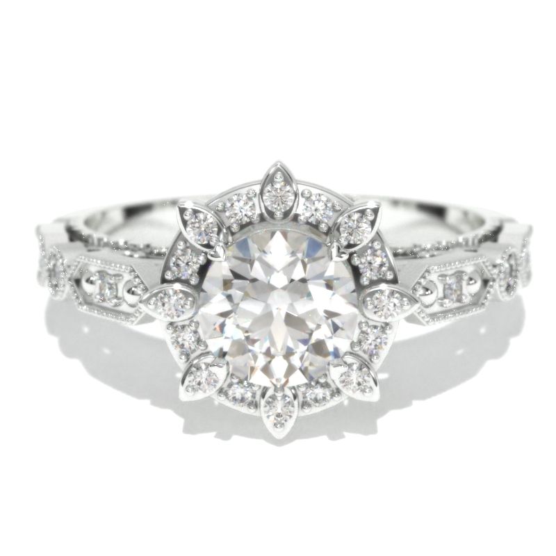 6mm round Giliarto Moissanite Center stone (D-Colorless, VVS1-Clarity, VG-Symmetry) with 30-0.2 CTW D-Colorless, VVS1 clarity moissanite accent stones and 14K white gold ring.