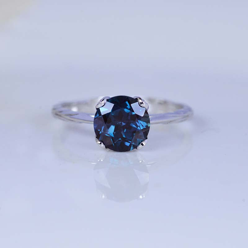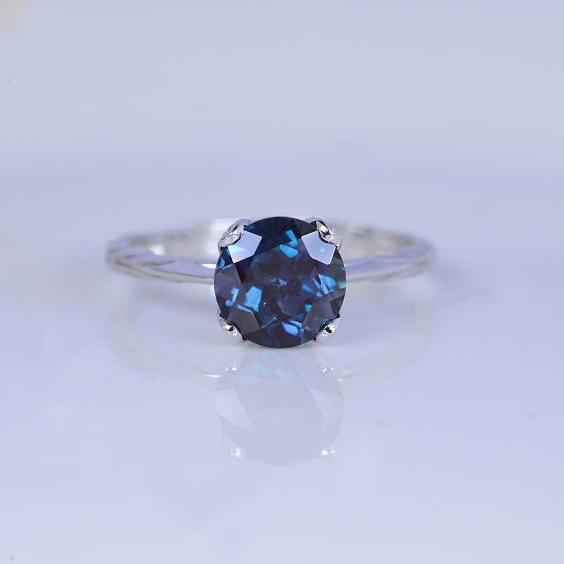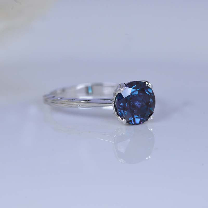 2.0Ā  Carat Ethically LAB-Grown Alexandrite Center Stone (Round 8mm, Ex-Cut, Ex-Polish, VG-Symmetry) with Two Eternity Bands set With Colorless Moissanites in 14KĀ  White Gold.
