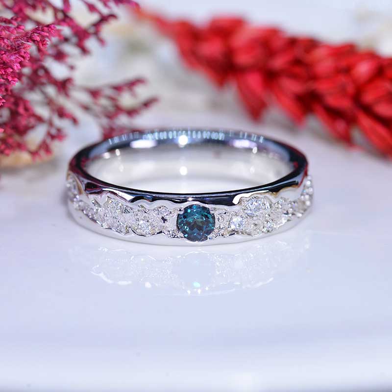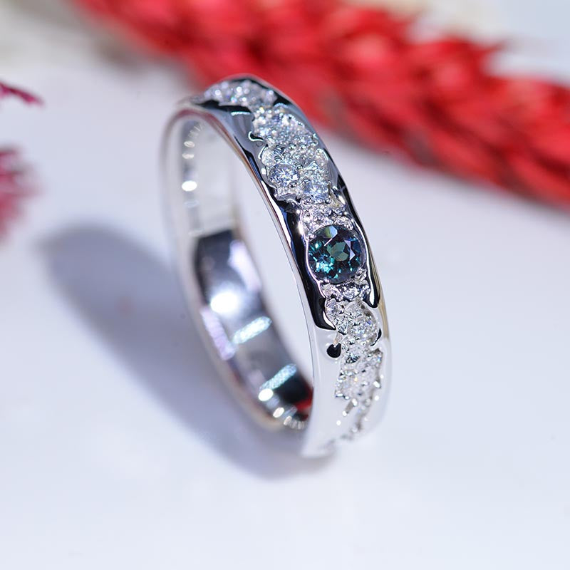 0.6 CTW Ethically Lab-Grown Alexandrite set with 26  D-Colorless Moissanites Accent Stones (VG-Cut, Ex-Polish, VG-Symmetry) Men's Ring 14K White Gold Ring. 6mm Wide