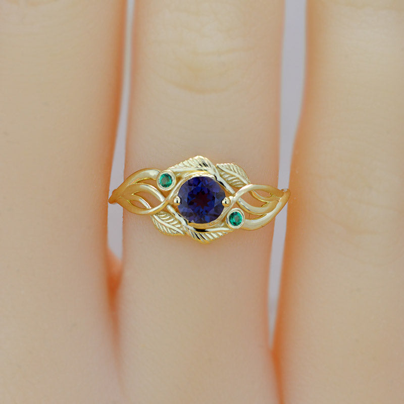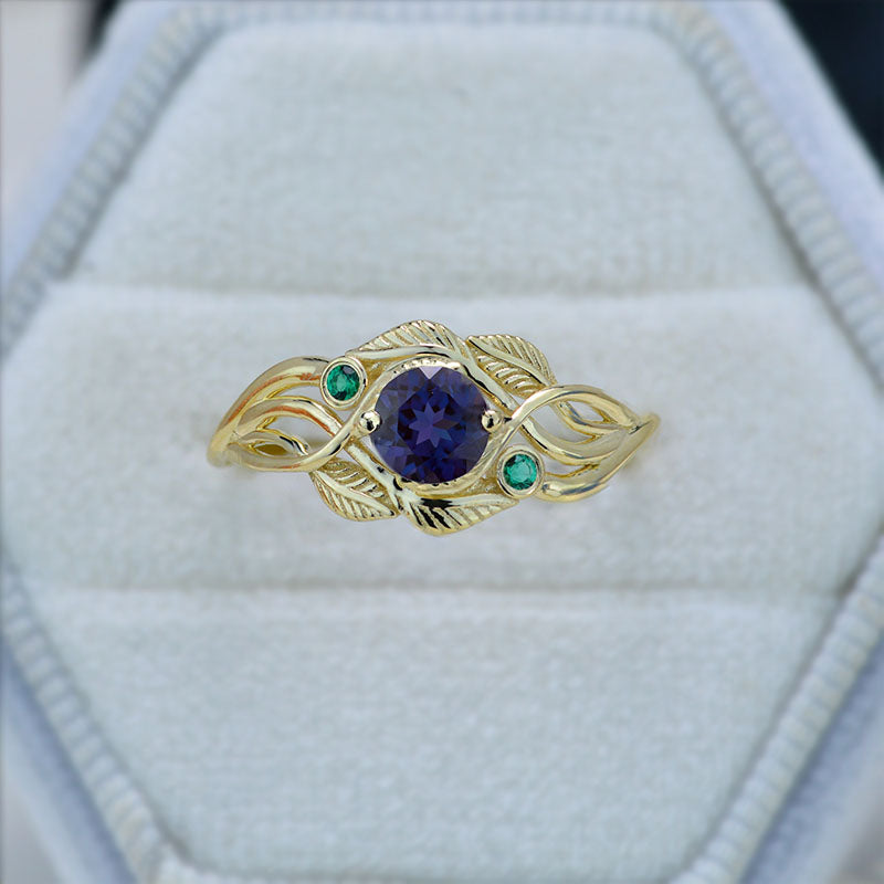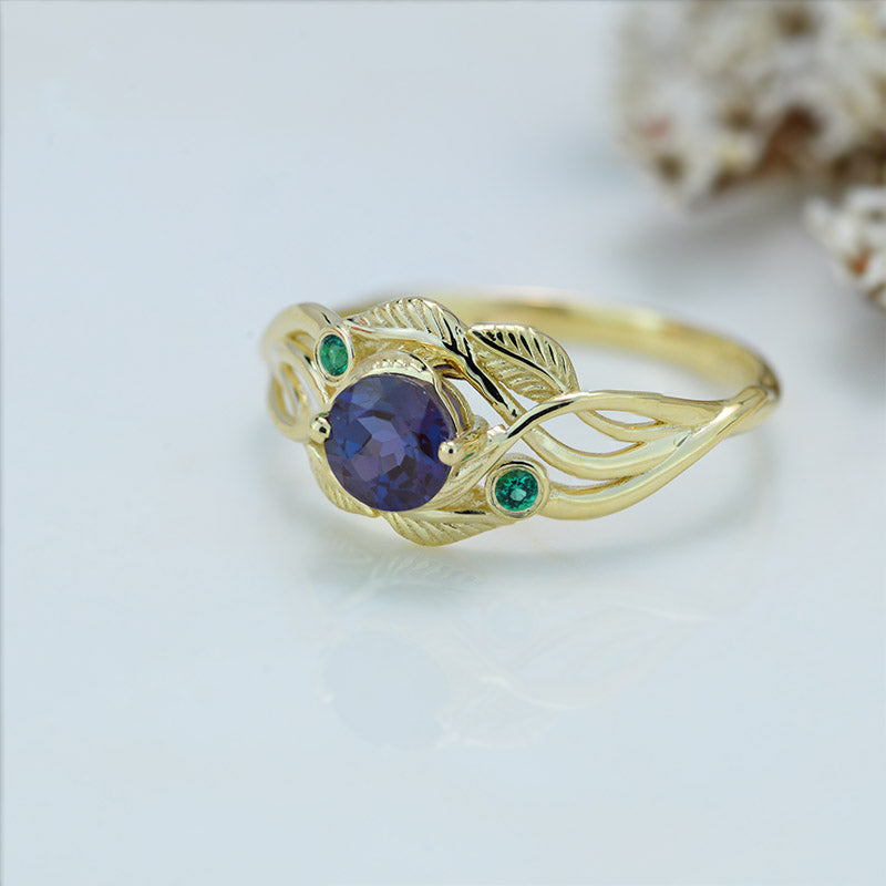 5mm Round Ethically LAB-Grown Alexandrite Center Stones  VVS1-Clarity Shape: Round, VG-Symmetry  with Emerald Accents Stones in 14K Yellow Gold.