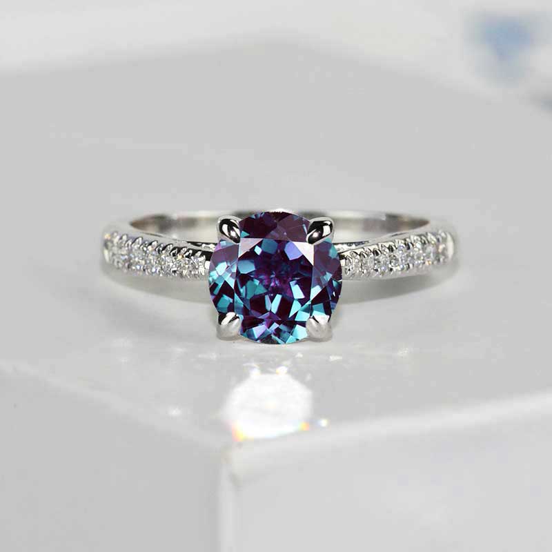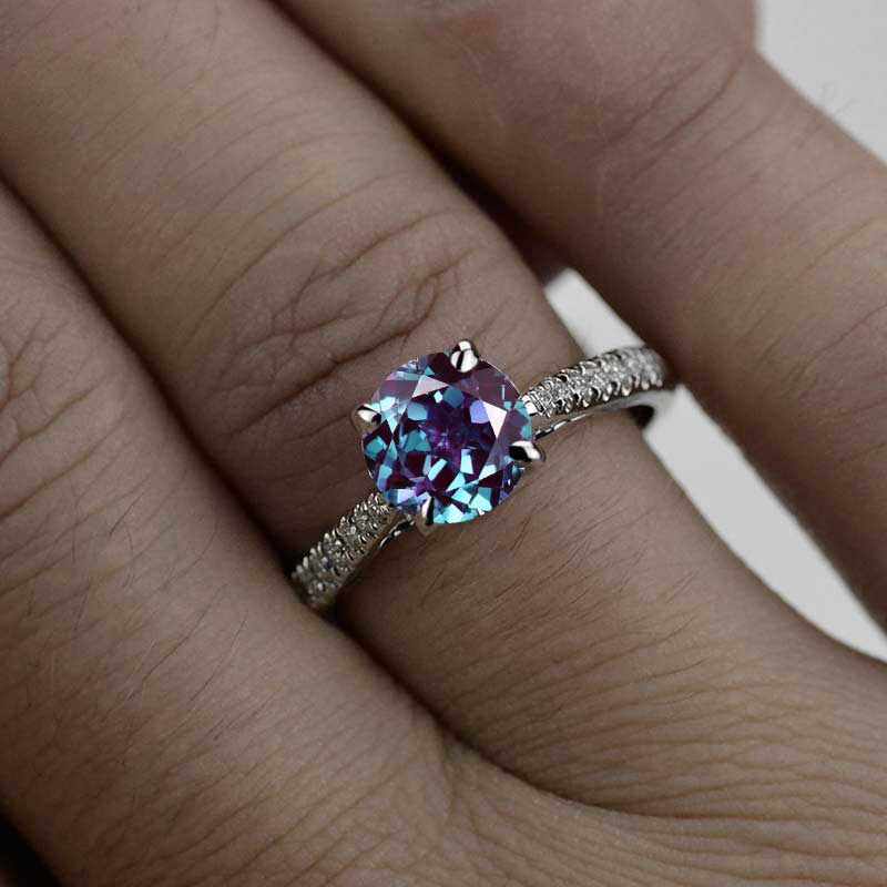 2.0 carat Ethically Lab-Grown Alexandrite center stone (round 8 mm, Ex-Cut, Ex-Polish, VG-Symmetry) and 16  accent stones  ( 0.2 CTW D-Colorless, VVS1 clarity) with  14K white gold.