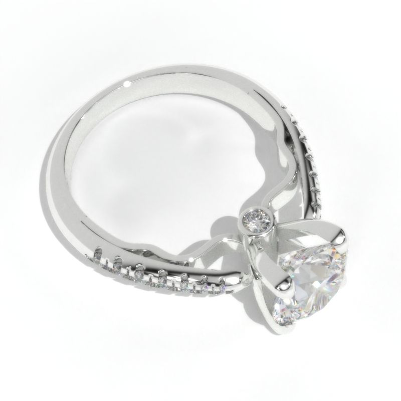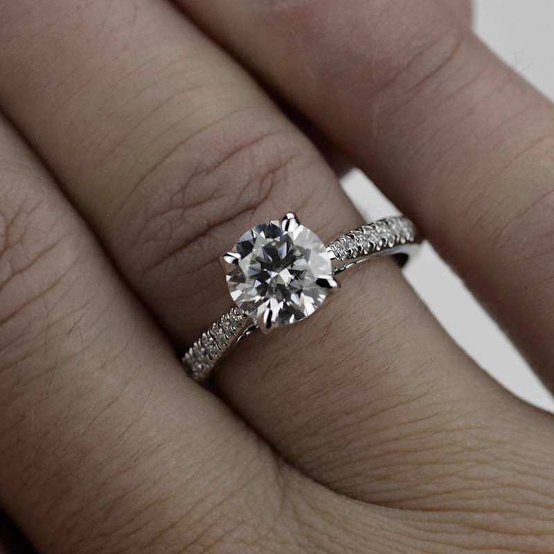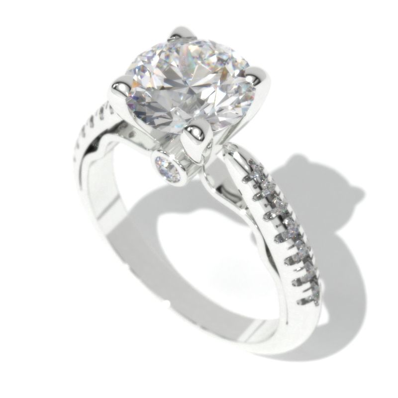 2.0 carat moissanite center stone (round 8 mm, D-Colorless, VVS1-Clarity, Ex-Cut, Ex-Polish, VG-Symmetry) and 16 accent stones ( 0.2 CTW D-Colorless, VVS1 clarity) with  14K white gold.