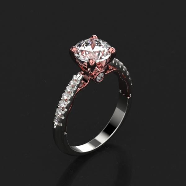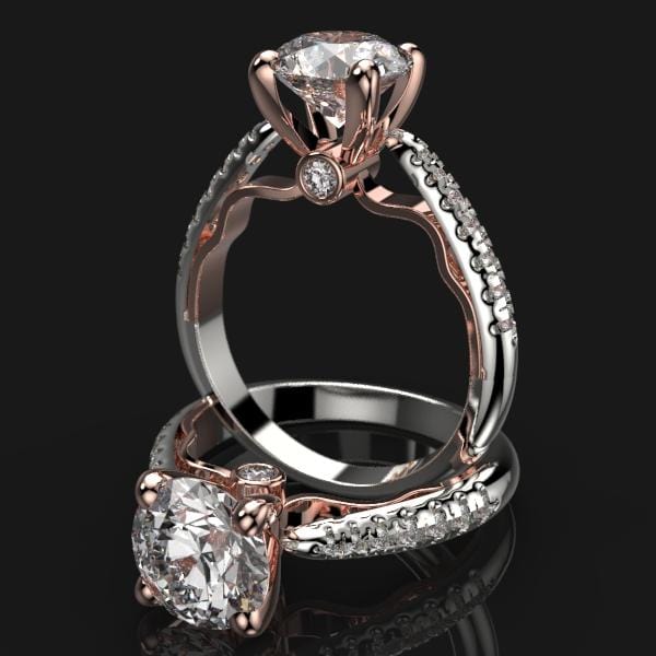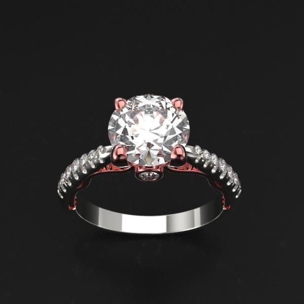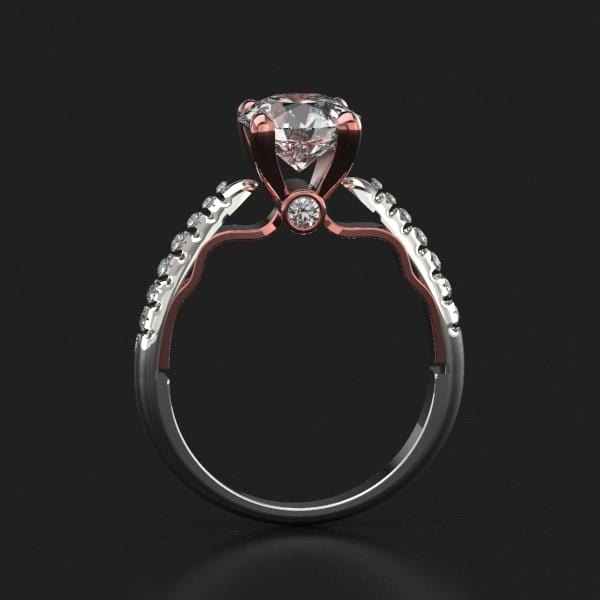 2.0 carat Forever One Moissanite center stone (round 8mm, D-Colorless, VVS1-Clarity, Ex-Cut, Ex-Polish, VG-Symmetry) and 16 diamond accent stones ( 0.2 CTW G-H color, VVS1 clarity) with  14K white and rose gold.