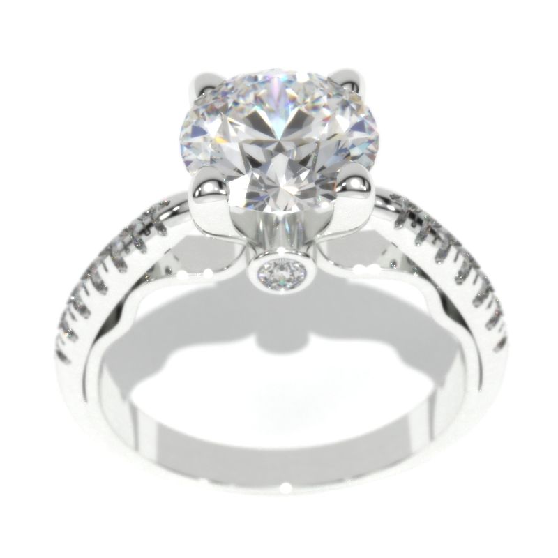 2.0 Carat Moissanite Center stone (Round 8mm, D-Colorless, VVS1-Clarity, Ex-Cut, Ex-Polish, VG-Symmetry) and 16 accent stones (0.2 CTW D-Colorless VVS1 clarity) with 14K white gold.