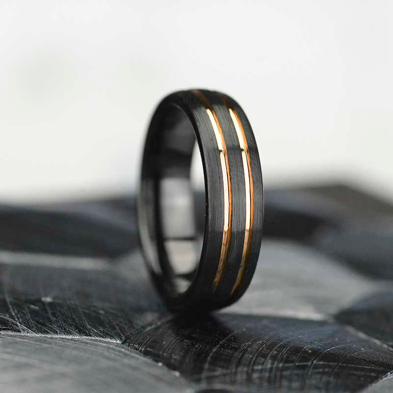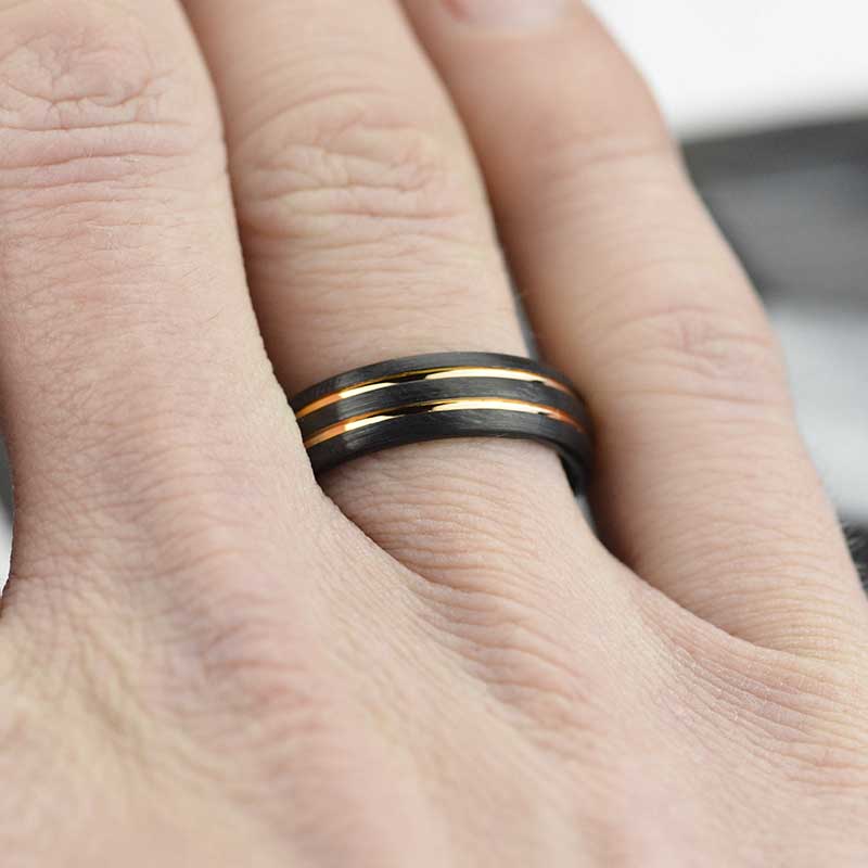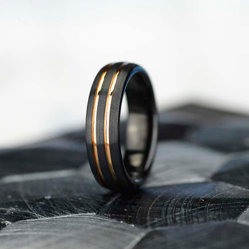 Brushed jet black tungsten band, with two yellow gold color plated strip  polished beveled edges, double gold center groove.