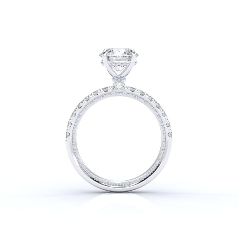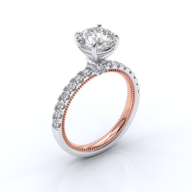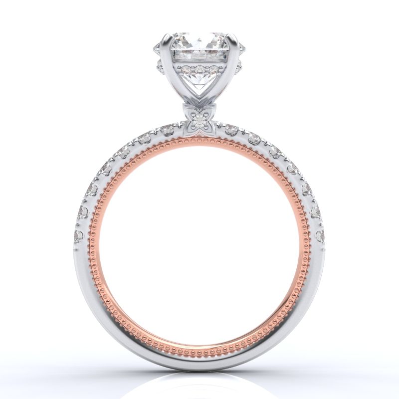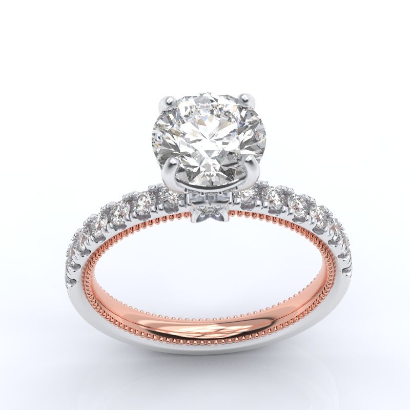 2.0 carat moissanite center stone (round 8 mm, H-Color, I2-Clarity, Ex-Cut, Ex-Polish, VG-Symmetry) and 28  accent stones ( 0.4 CTW G-H color, I1 clarity) with  14K white/rose gold.