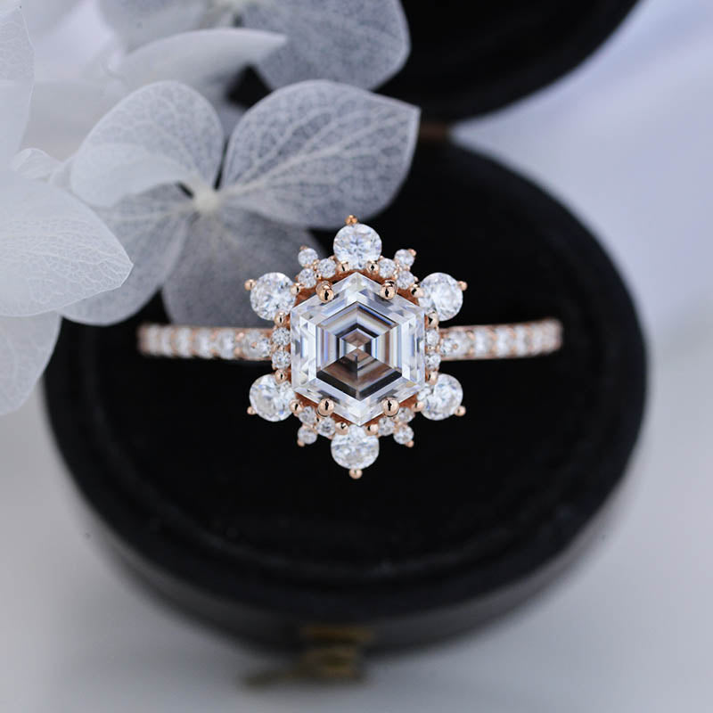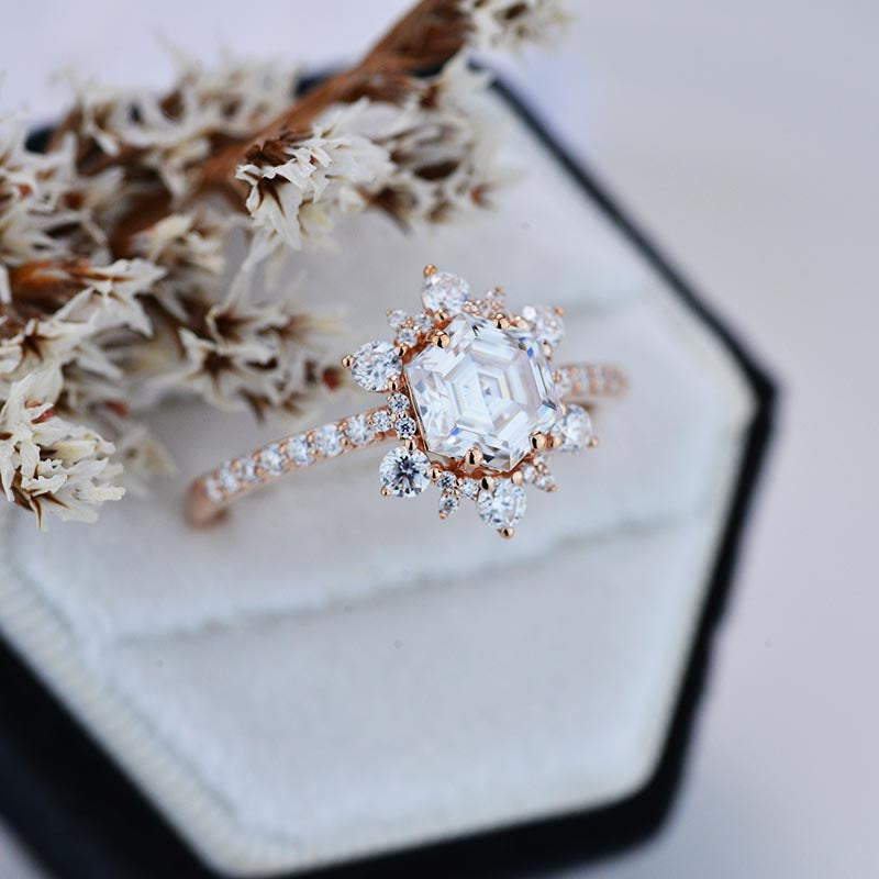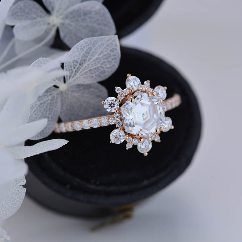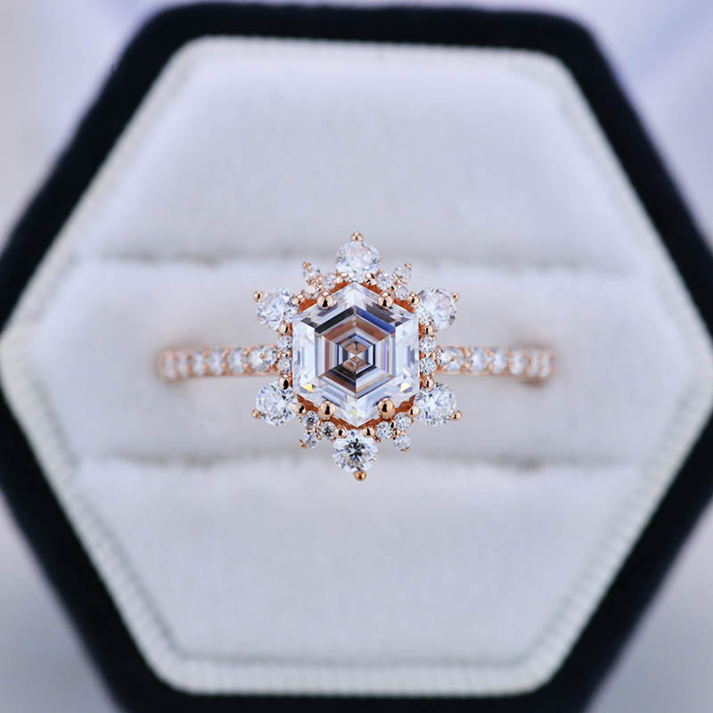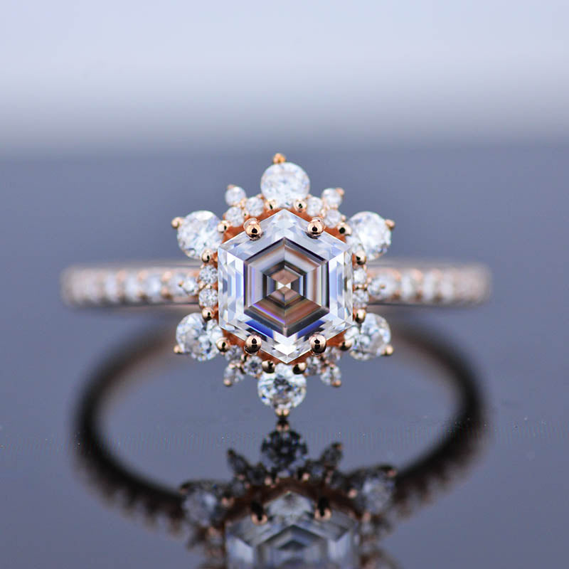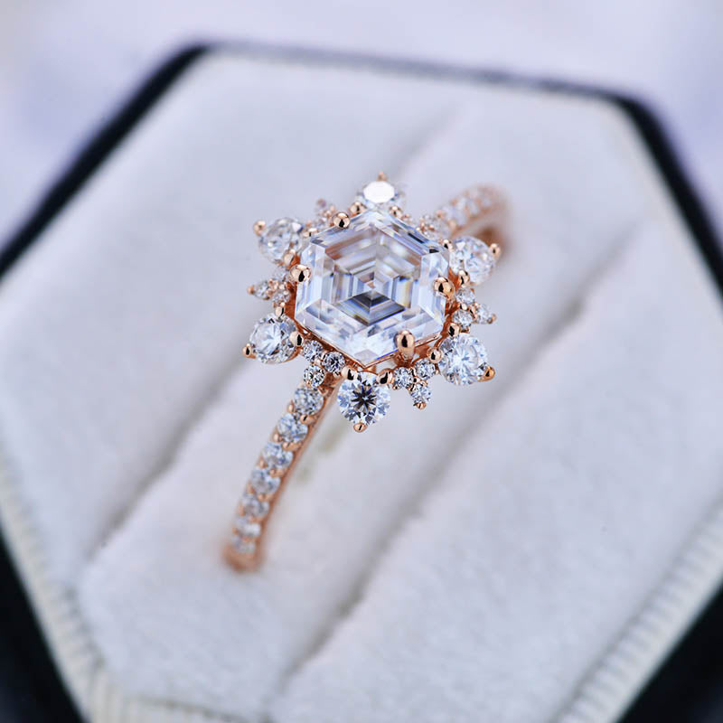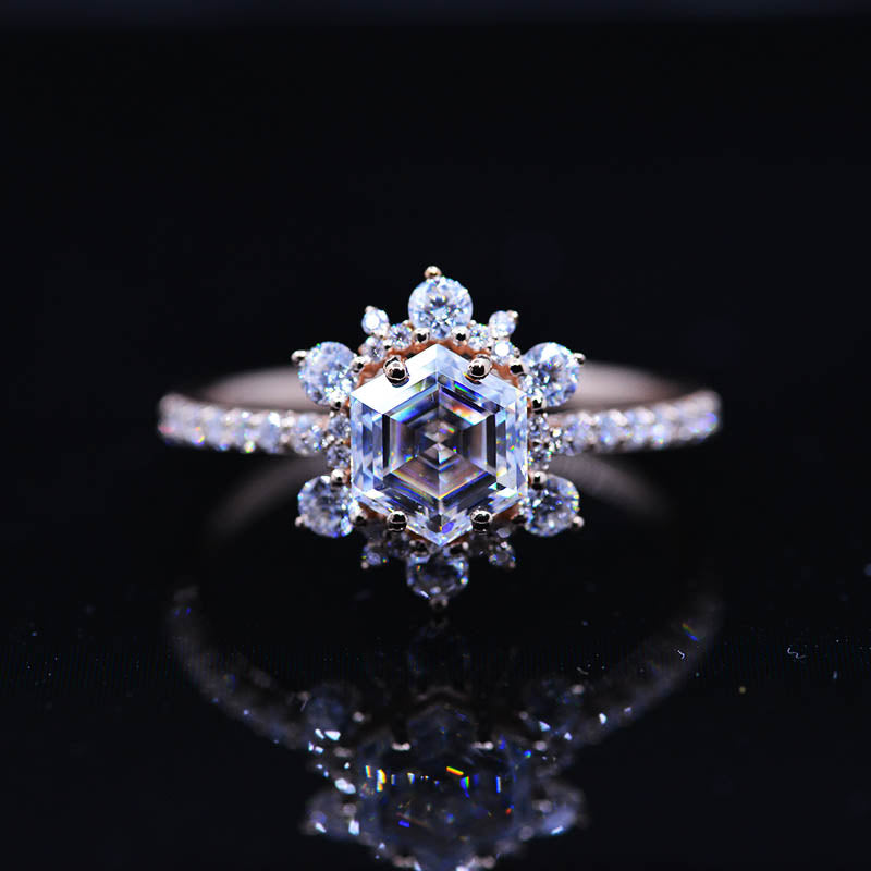 The default design option features 8mm Hexagon Cut Moissanite Stone, D-Colorless, VVS1-Clarity, VG-Cut, Ex-Polish, VG-Symmetry with 0.6 C.T.W. Accent Stones