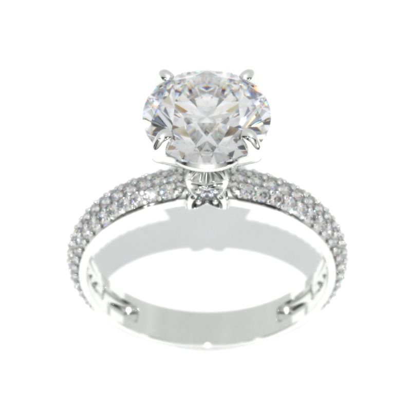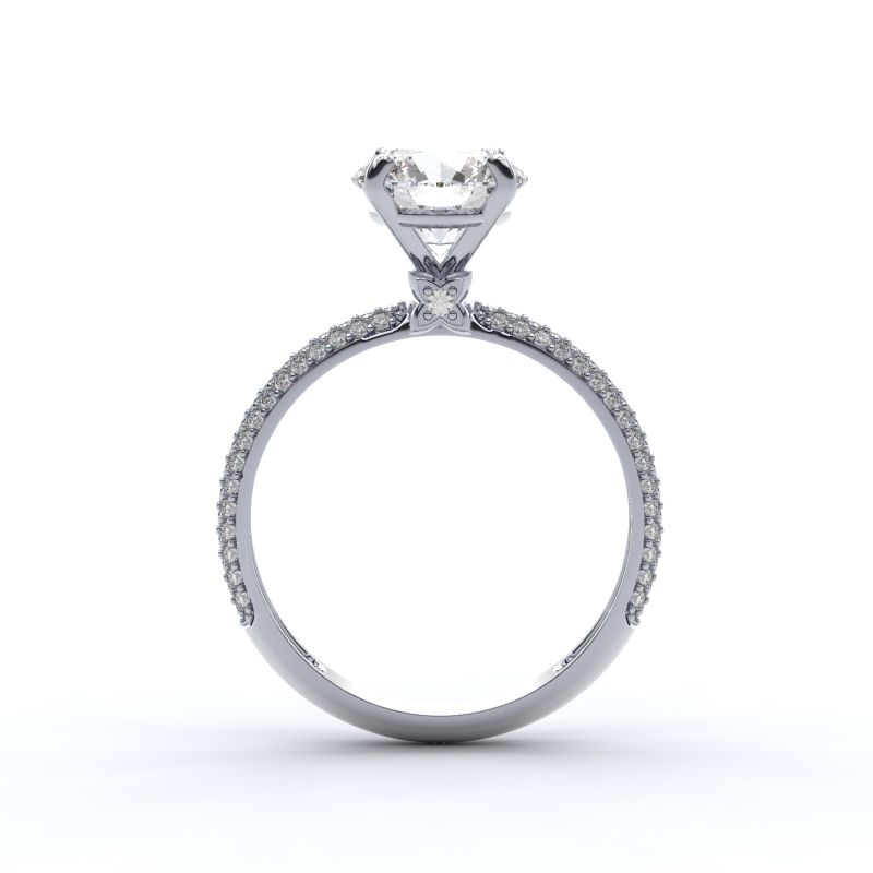 On the image featured 2.0 carat round Giliarto Moissanite ( D-Colorless, VVS1-Clarity,  VG-Symmetry) with 100 - 0.4 CTW  Moissanite accent stones and 14K white gold ring.