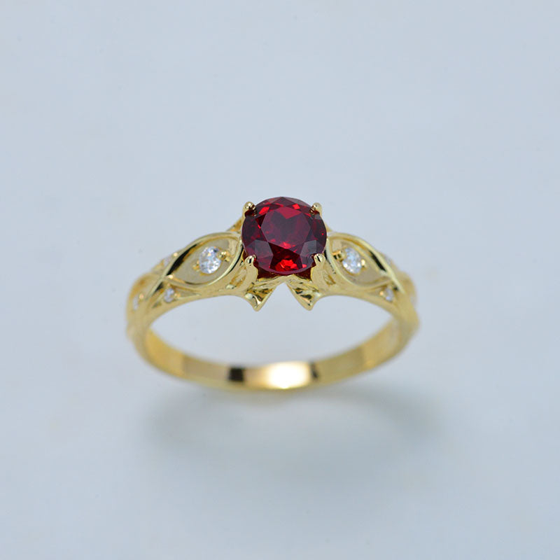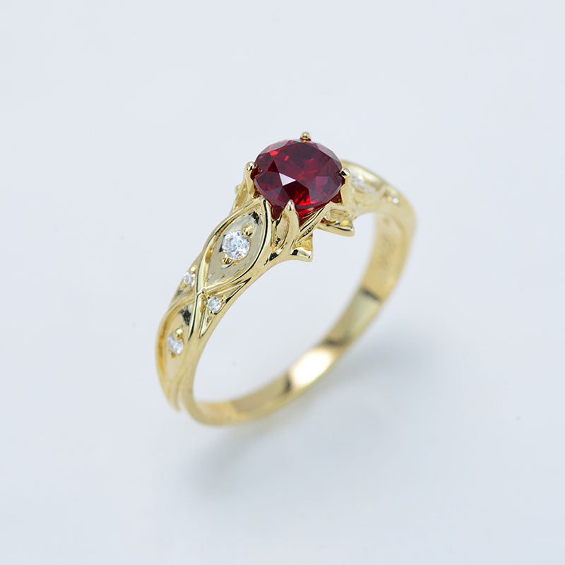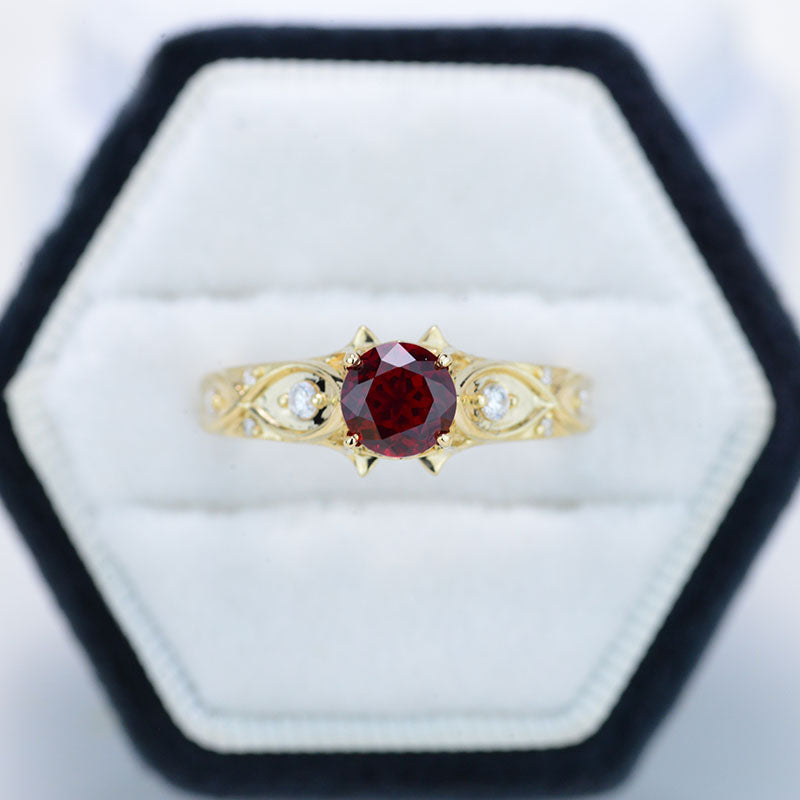 The default design option features 6mm Ethically LAB-Grown Round Ruby, VVS1-Clarity, VG-Cut, Ex-Polish, VG-Symmetry with Colorless D-Moissanite Accent Stones