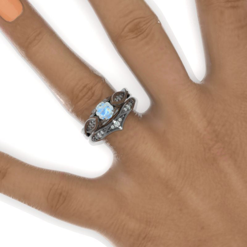 Celtic Genuine Natural Moonstone Curved Wedding 14K Black Gold Ring Ver 2