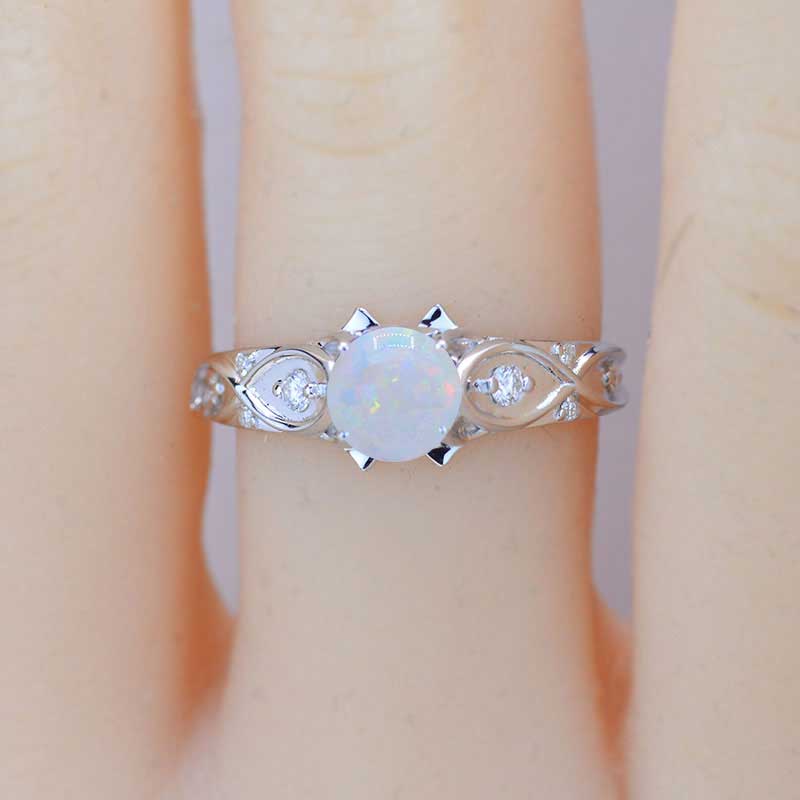 6mm Round Natural White Opal Center Stone and 8 Colorless Moissanite AccentsÂ
