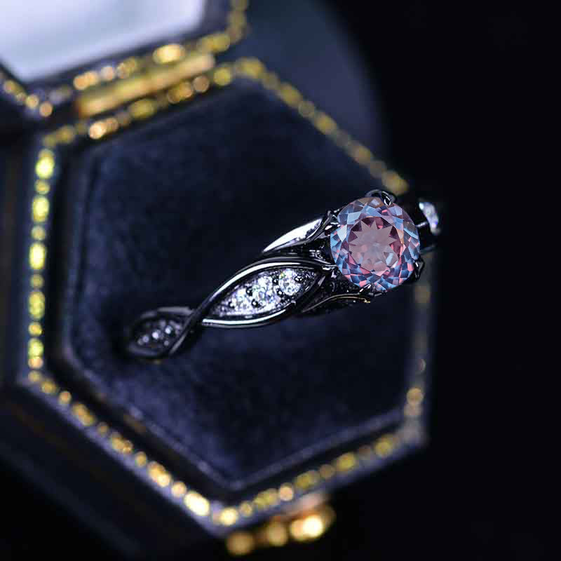 1 Carat Portuguese Cut Ethically LAB-Grown Alexandrite Center Stone-Round 7mm, Ex-Cut, Ex-Polish, VG-Symmetry) and 8 - Moissanite Accents 0.1 CTW with 14K Black Gold.