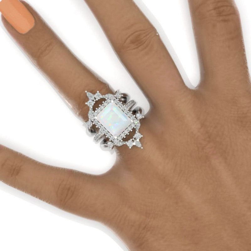 14K Solid Gold Ring 5CT Radiant Cut Genuine Natural White Opal Halo Engagement Ring Set. Set of Three Eternity Gold Ring, Vintage Style Ring