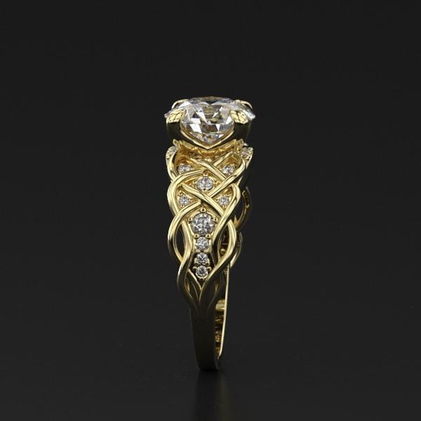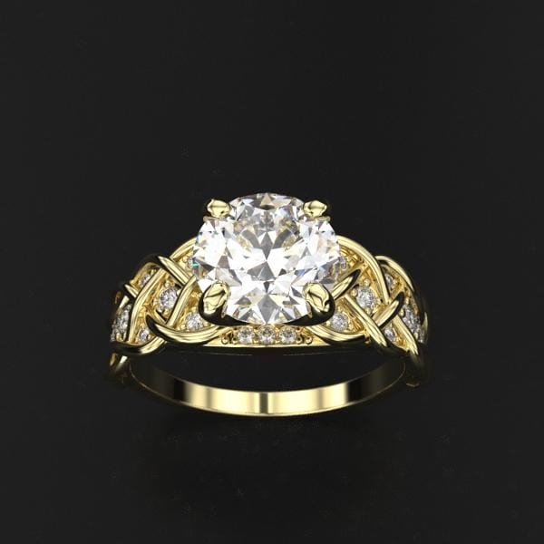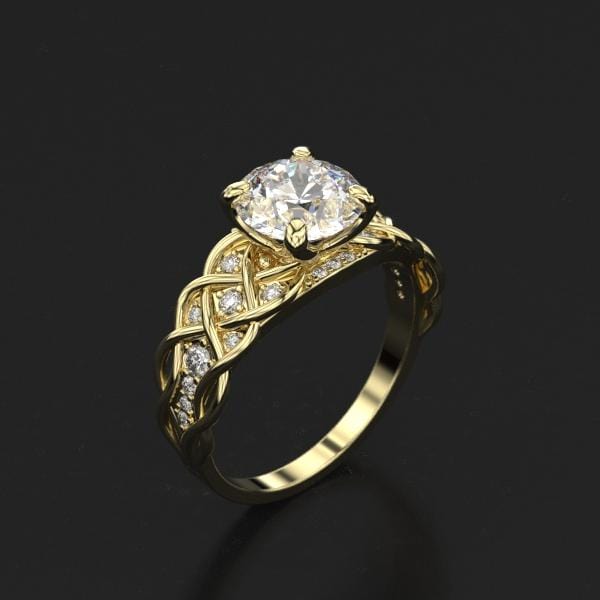 This one of a kind ring features beautiful lattice design which embeds gorgeous jewels of your choice and elegantly twists into the main center stone .