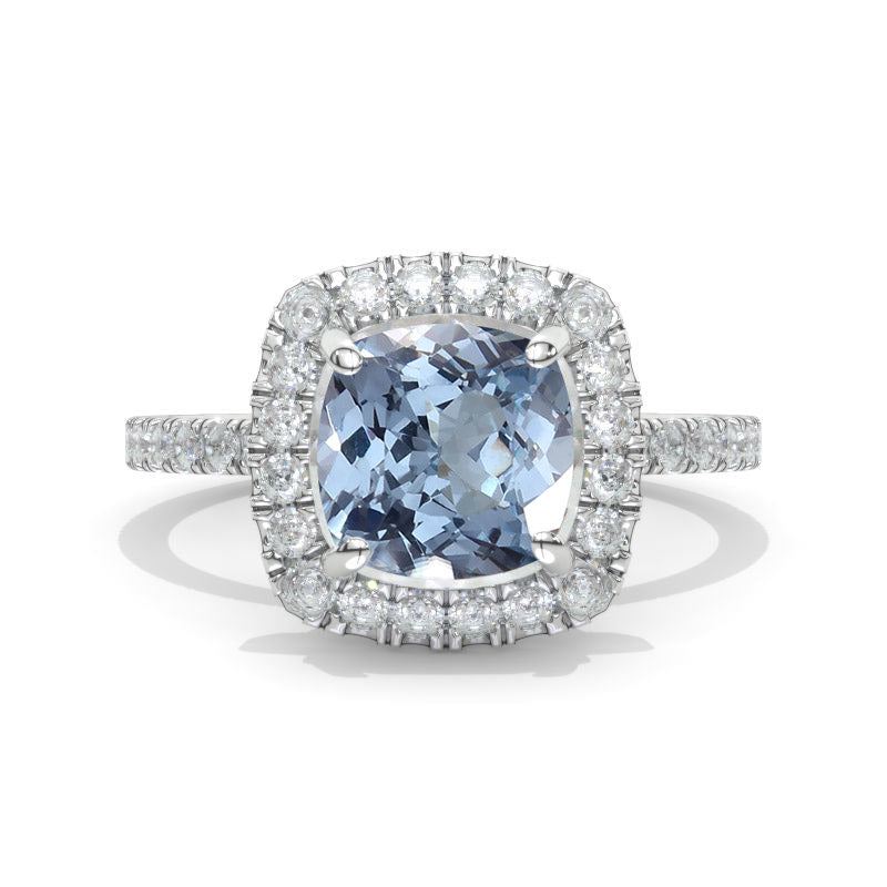 The default design option features 8x8mm Cushion Brilliant Cut Genuine Aquamarine AAA+ Quality StoneVVS1-Clarity, VG-Cut, Ex-Polish, VG-Symmetry with 0.7 TCW Moissanite Accent Stones