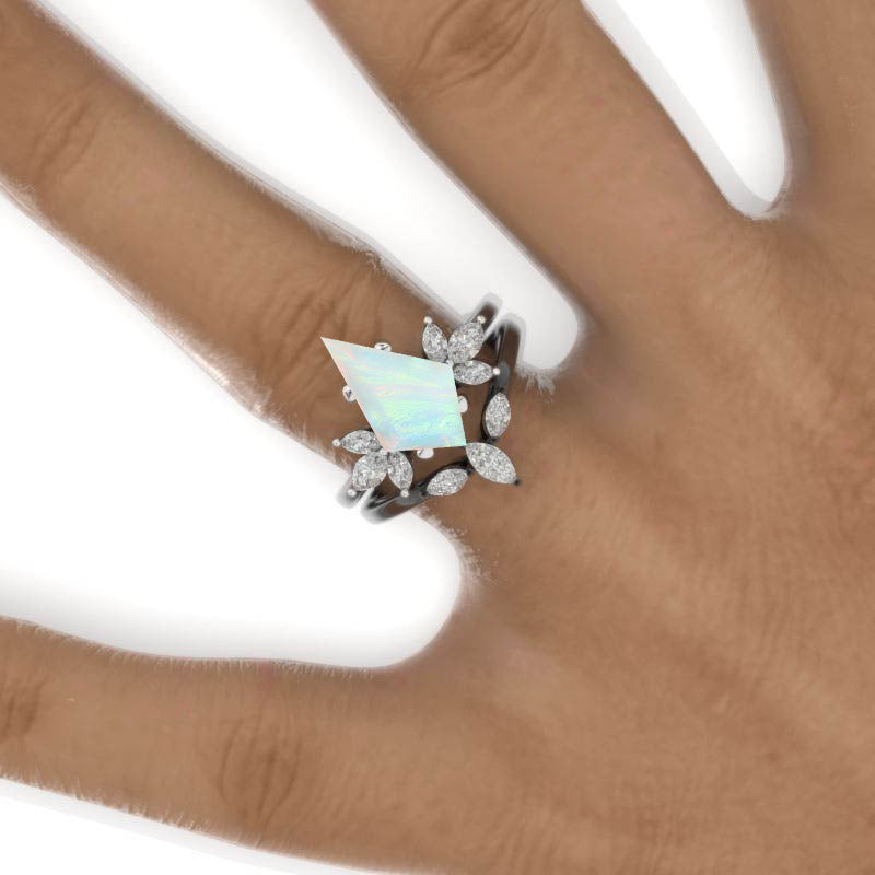 The default design option features 12x8mm Kite Center Genuine Natural White Opal Stones, Moissanite Accent D-Colorless, VVS1-Clarity, VG-Cut, Ex-Polish, VG-Symmetry