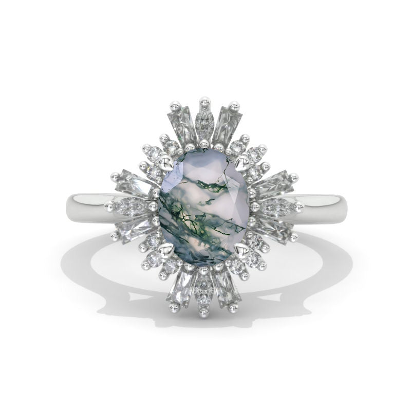 The default design option features 2 Carat Genuine Moss Agate 9x7mm Oval Center Stone, VG-Cut, Ex-Polish, VG-Symmetry