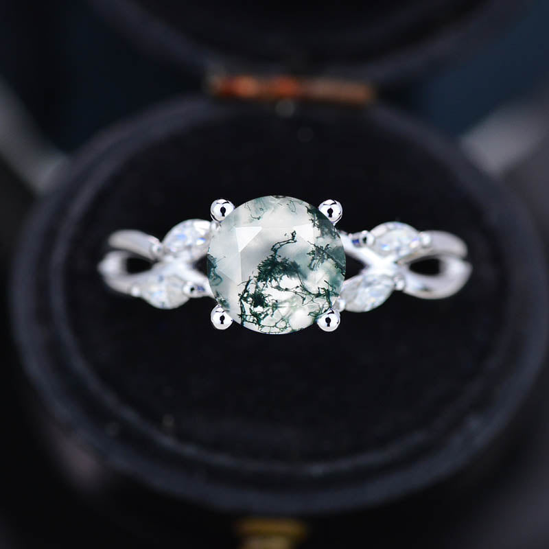 2Ct Round Genuine Moss Agate Vintage Engagement Ring, Genuine Moss Agate Engagement Ring, Marquise Side Accents Stones 14K White Gold Ring Model 562-8