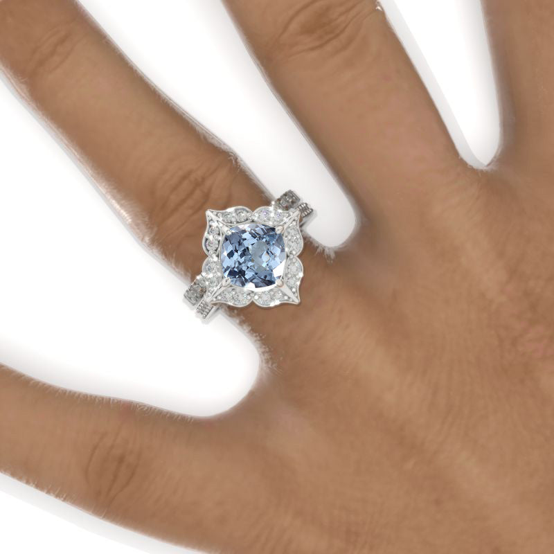 Engagement Ring: 3 Carat Genuine Aquamarine AAA+ Quality Center Stone Cushion 8x8mm and Moissanite Accents : D-Colorless, VVS1-Clarity, VG-Cut, Ex-Polish, VG-Symmetry Center Stone in 14K White Gold Ring.