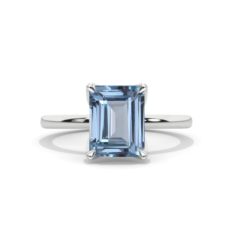 The default design option features approximately 3 Carat Genuine Aquamarine Emerald Shaped Step Cut 9x7mm VVS1-Clarity, VG-Cut, Ex-Polish, VG-Symmetry Center Stone set in 14K White Gold.