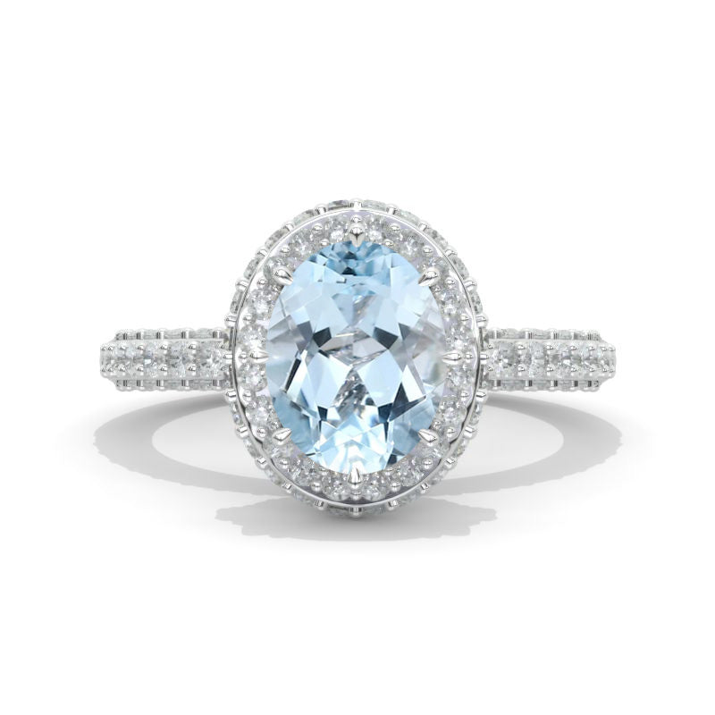 The default design option features 3 Carat Oval Cut 10x8mm Genuine Aquamarine Center Stone VVS1-Clarity, VG-Cut, Ex-Polish, VG-Symmetry with 0.5 CTW Moissanite Accents