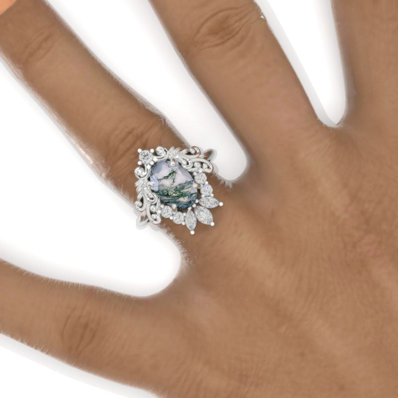 Copy of 3 Carat Oval Genuine Moss Agate Halo Ornamental Engagement Rin - Giliarto