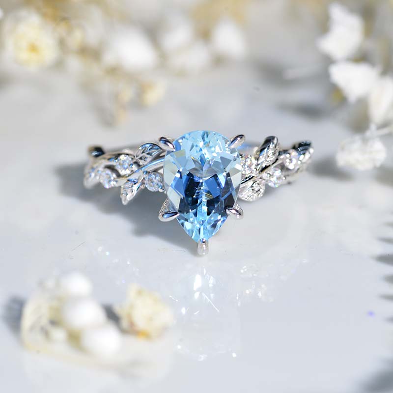 3 Carat Pear Cut Genuine Aquamarine Floral Gold Engagement Ring - Giliarto