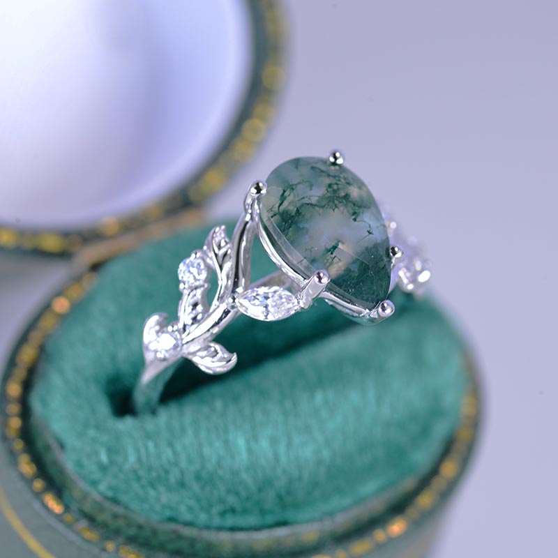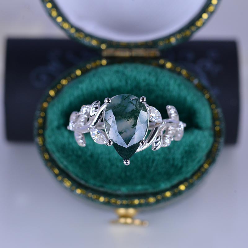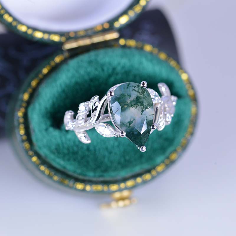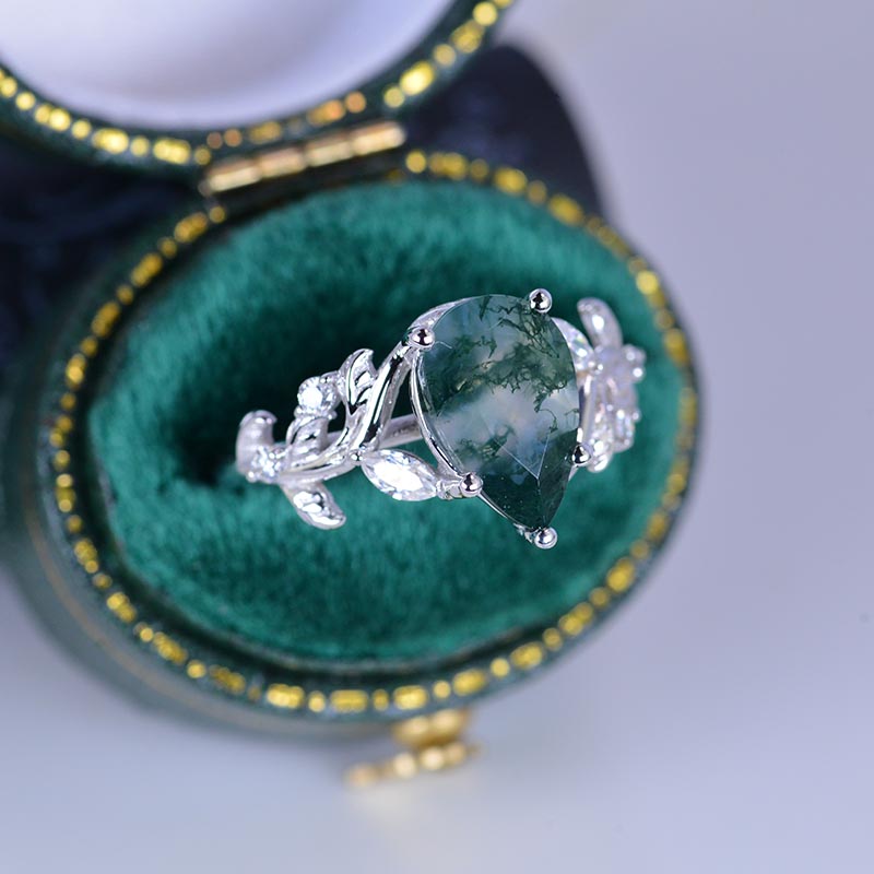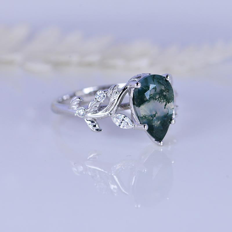 3 Carat Pear Genuine Moss Agate Halo Floral Engagement Ring 14K White - Giliarto
