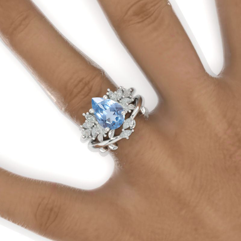 3CT Pear Shape Genuine Aquamarine Engagement Ring Set, 3 Carat Pear Floral Twig Design 14K White Gold,