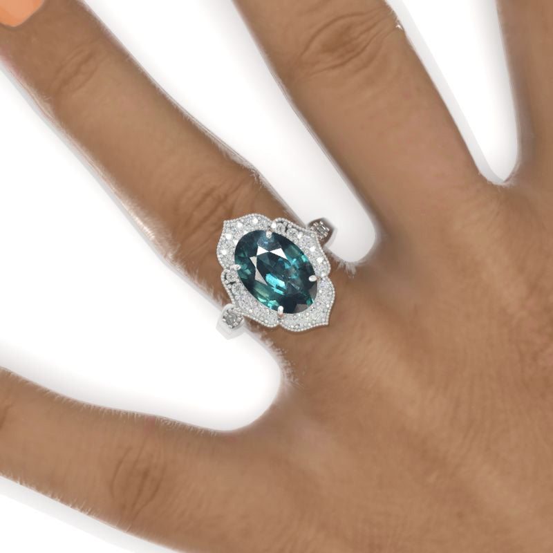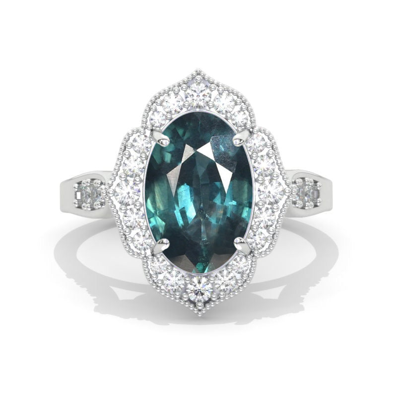 The default design option features 12x8mm Oval Cut Ethically LAB-Grown Teal Sapphire and Accent Stones, D-Colorless, VVS1-Clarity, VG-Cut, Ex-Polish, VG-Symmetry, Set with Colorless Moissanite Accent stones in 14K White Gold Engagement Ring.