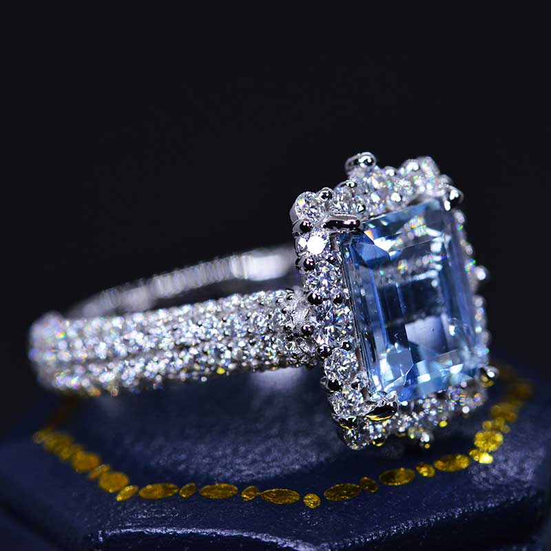 The default design option features 4 Carat 10x8mm Emerald Cut Genuine Aquamarine AAA+ Quality  Center Stone set with 1.2 CTW Moissanite Accent Stone: D-Colorless, VVS1-Clarity, VG-Cut, Ex-Polish, VG-Symmetry