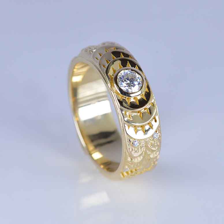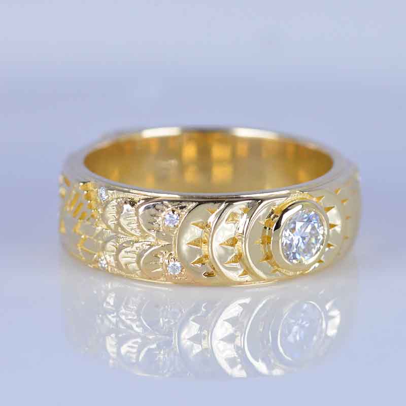 0.5 Carat Moissanite Round 4.5mm, D-Colorless, VVS1-Clarity, Ex-Cut, Ex-Polish, VG-Symmetry and 12 Accents stones 0.1 CTW in 14K Yellow Gold Men's Ring.Â