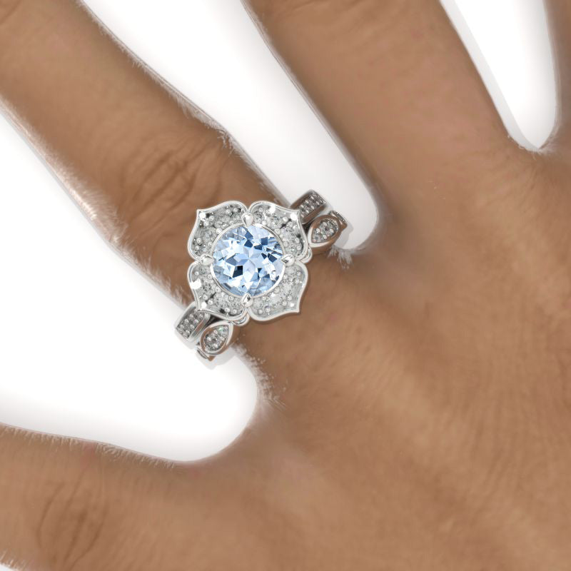 Genuine Aquamarine Floral Halo 14K White Gold Engagement Ring, Eternity Ring Set