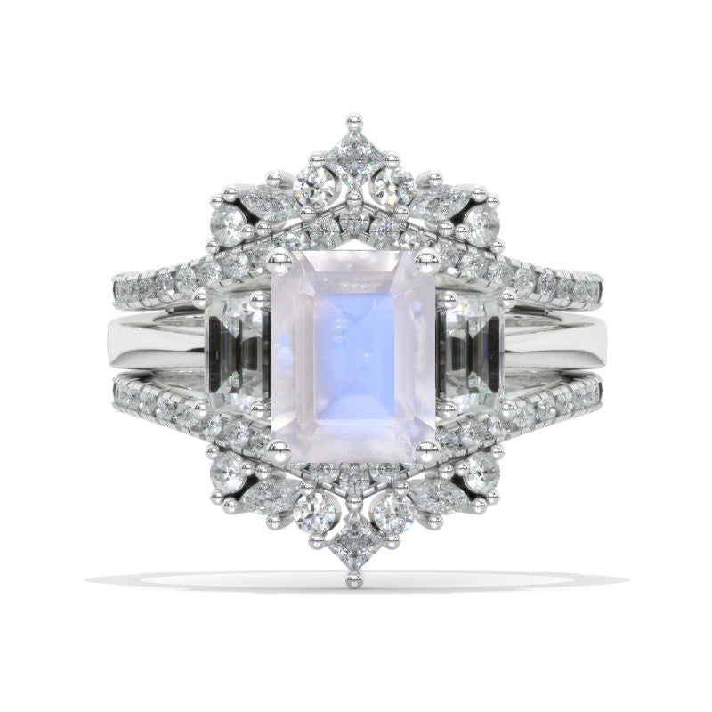 Curved V Band Pavé Genuine Natural Moonstone Double Ring Insert 14K Wh - Giliarto