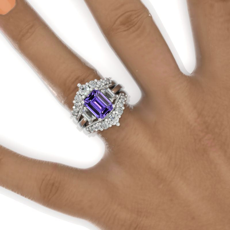 Curved V Double Band Pave Purple Sapphire Double Ring Insert 14K White Gold