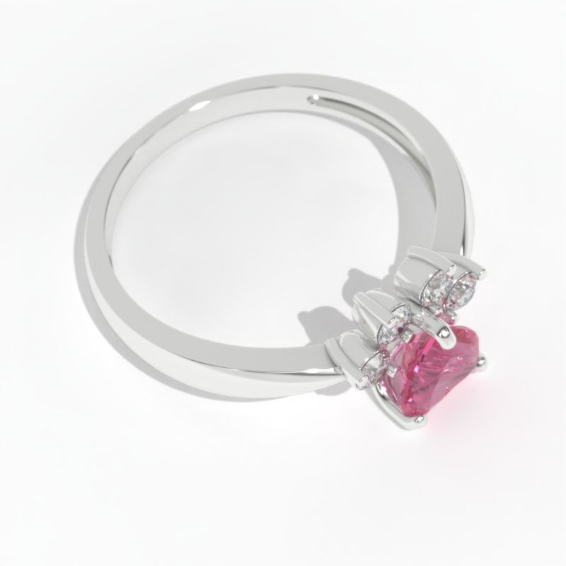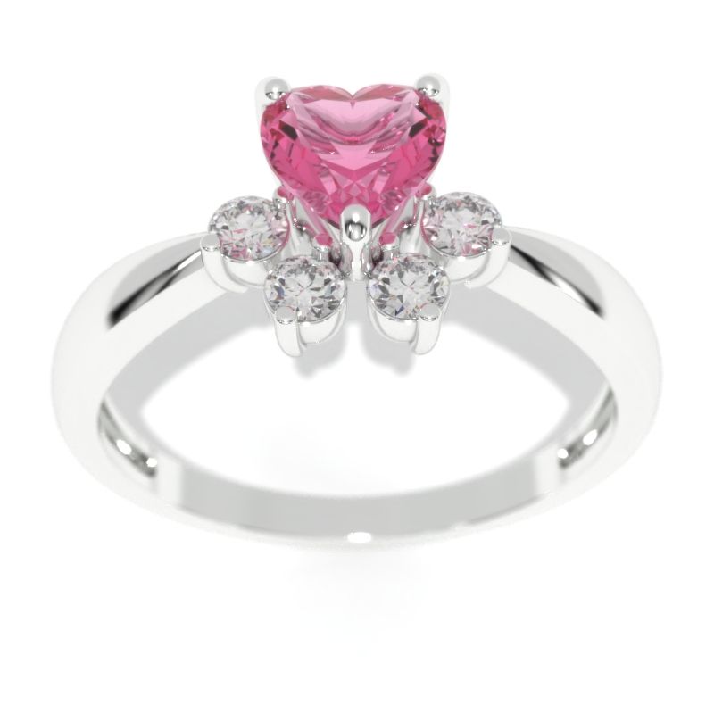 Center Stone is Pink Created Sapphire and Moissanite Accent Stones in 14K White Gold.Â