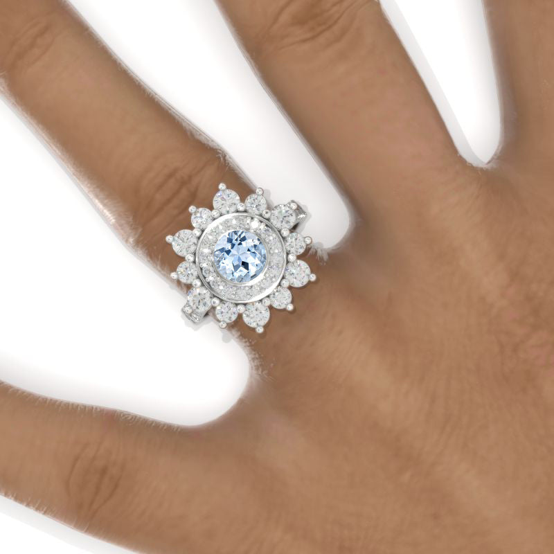 Double Halo Genuine Natural Aquamarine Cluster Ring - Giliarto